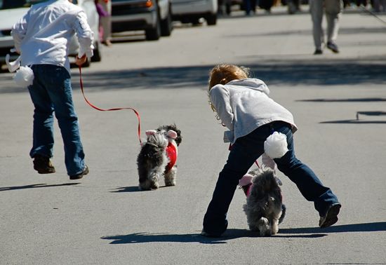 Abe Lochner and his sister Ruby in the home stretch of the Pet Parade. Dressed as rabbits, they walked Nancy Inger’s dogs.