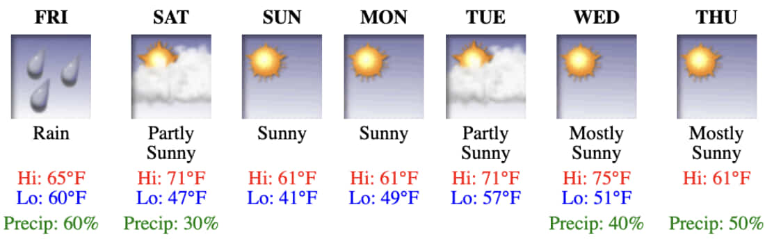Sunny & 60~ish today, then highs near 70 for the rest of the week.