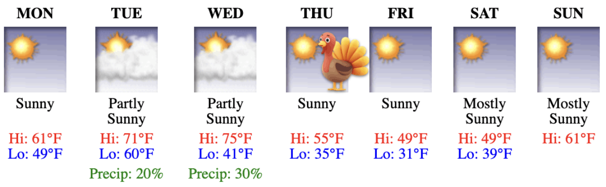 Sunny and low 60s today. Thanksgiving Day is forecast to be cooler, but sunny & dry.