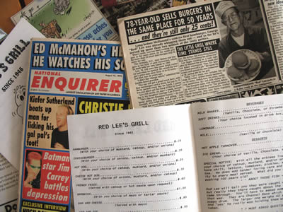 The signs that graced the front of Red Lee’s Oriental grill – “HOT DOGS 25¢ - hang above the wood lathe screen that, before the museum moving in, was a partition in Jill’s Beauty shop. Original copies of August 1995 Enquirer exclaim how the “78-YEAR-OLD SELLS BURGERS IN THE SAME PLACE FOR 50 YEAR … and they’re still only 25 cents!” A menu from Lee’s grill describes how to get around Oriental – “Our local police, Jim Bunn is helpful with directions.”