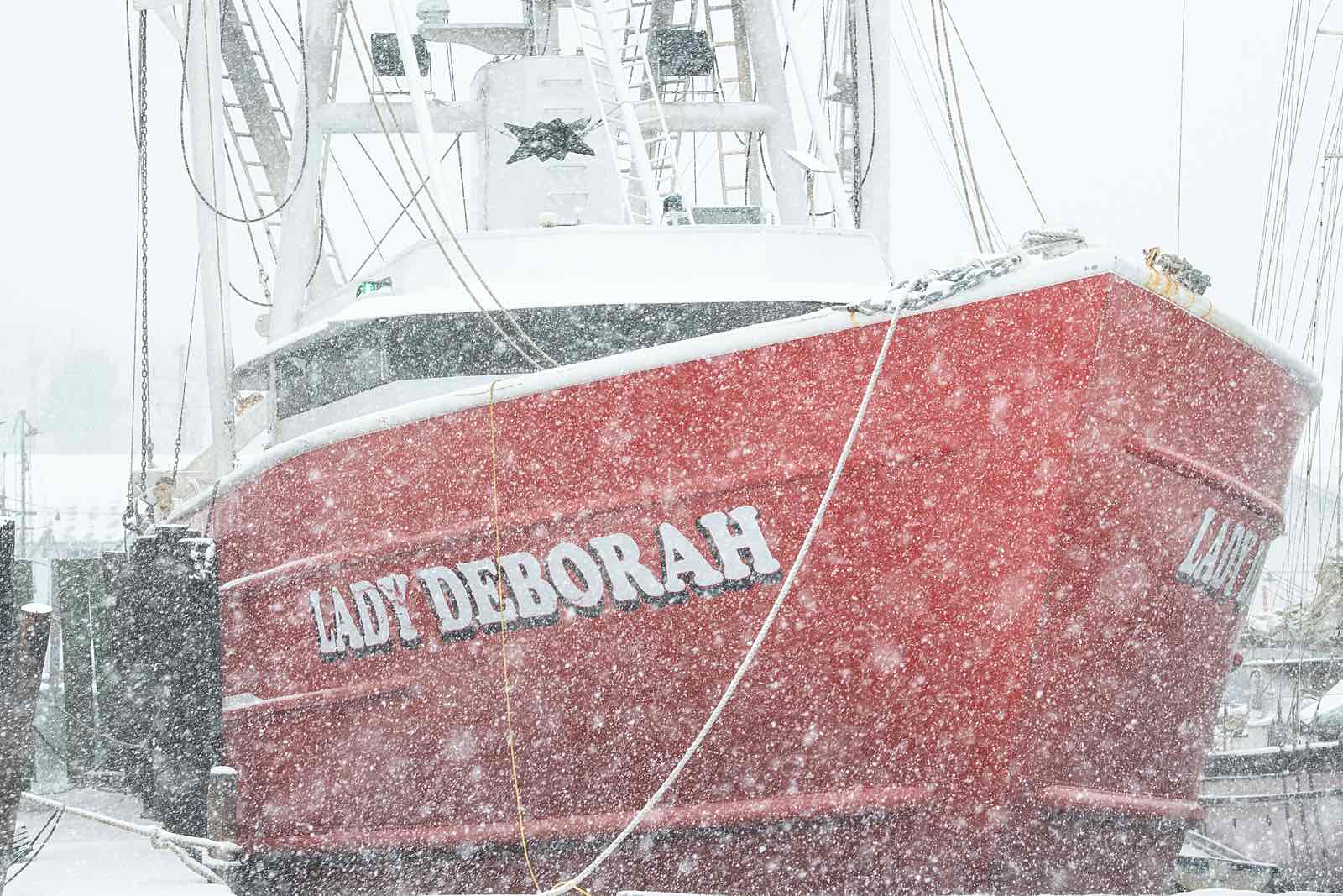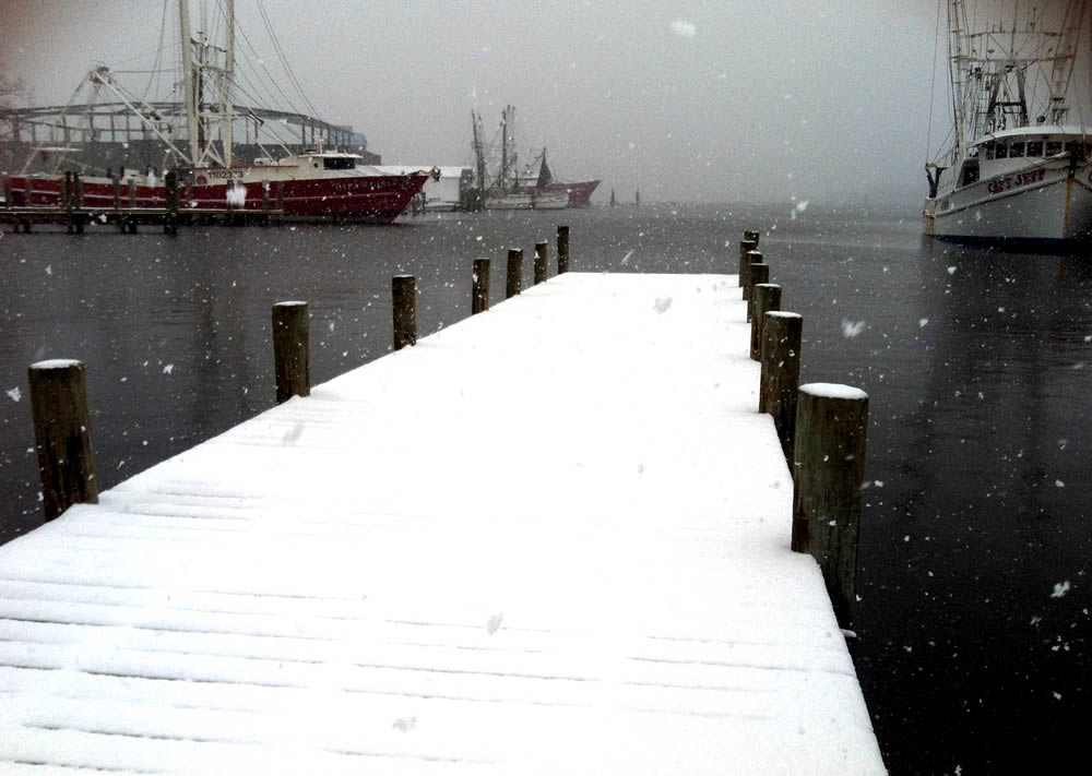 Though the ice is now melting, here’s a view of Lady Deborah at the height of the snow storm. (Joe Clark photo) More views of snow in Oriental here.