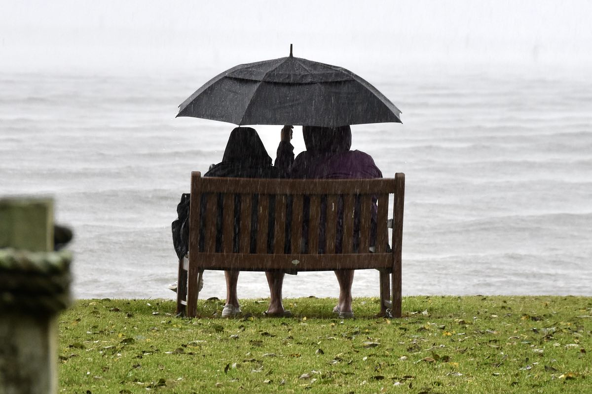 Yesterday’s sunshine has given way to rain. From the archives: a couple enjoys the rain from a bench overlooking the Neuse River.