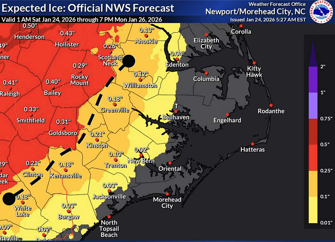 NOAA’s latest ice prediction has ice falling… up until just west of town. Will it be so cooperative?