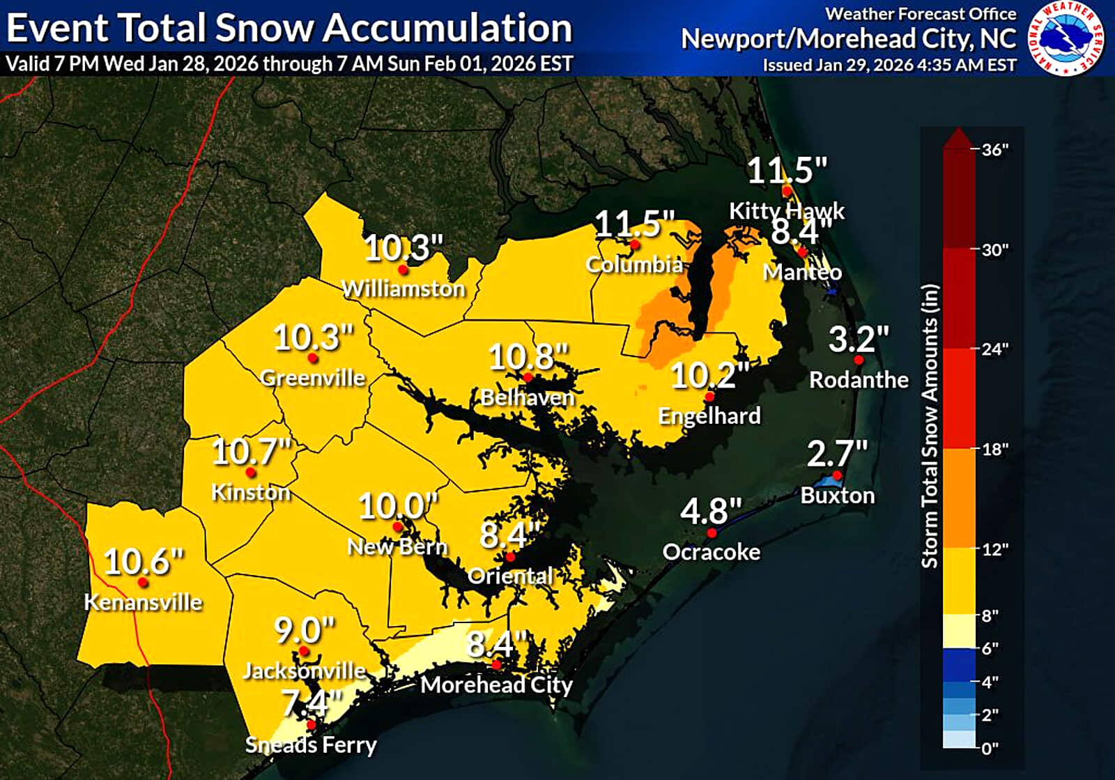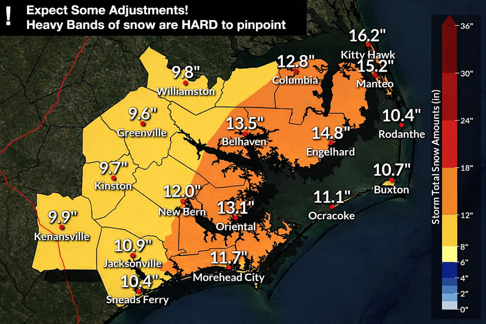 Sat 7a: The latest snow forecast, 8-12 inches. Max snowfall will be late Saturday night through Sunday morning. NOAA says “worst case” for Oriental: 15 inches. TownDock Senior Management refers to that as “best case”.