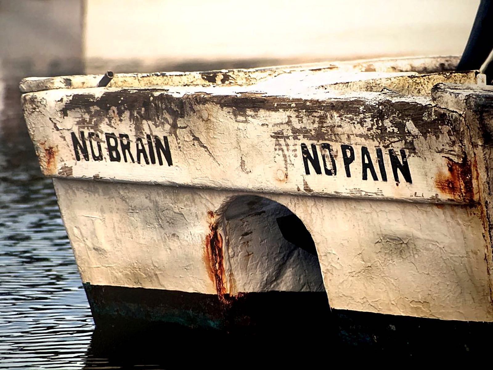 No Brain No Pain is a fishing vessel in the harbor at Atlantic (population 458), on the Core Sound. The photo is by Ben Casey – from his book Core Sound People.