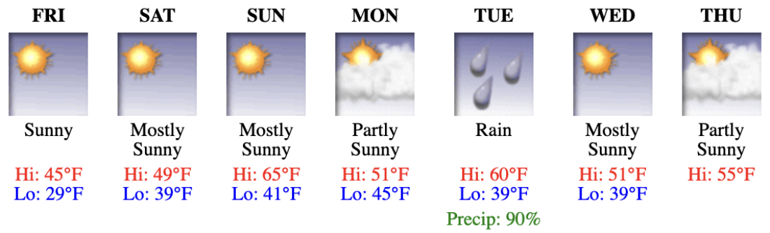 Sunny & 60~ish today, then highs near 70 for the rest of the week.