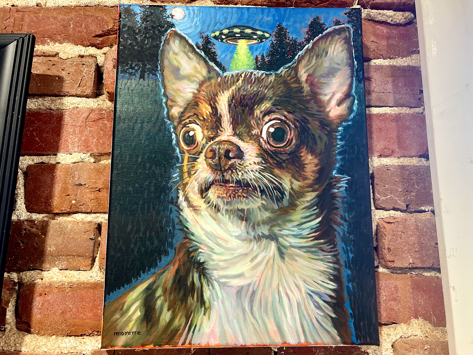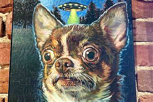 Dog and UFO by Tommy Midyette. It hangs near Midyette’s more traditional portraits at Broad Strokes Gallery. Click for the full view10:29a Student artists exhibited their work, and attended a reception in their honor, at Broad Strokes Gallery this past weekend.