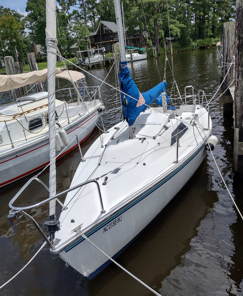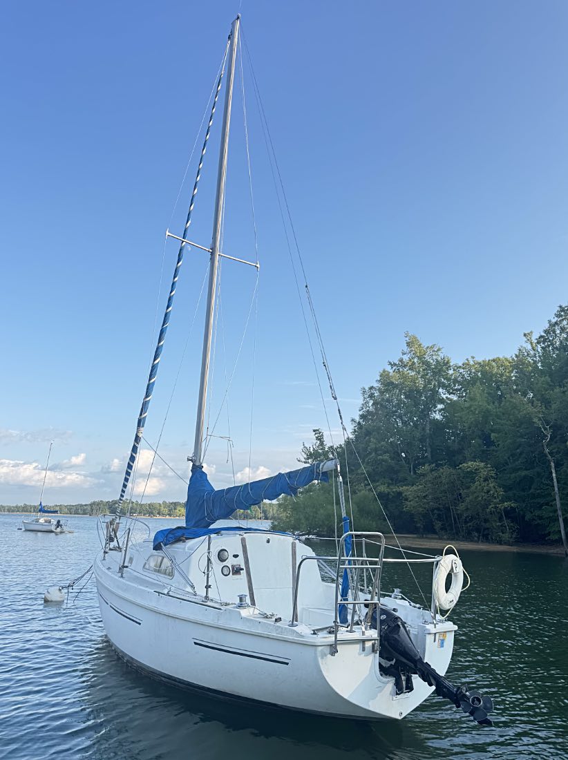 Pearson 26 sailboat, 1975 Currently moored in UNC Recreation Area cove on Kerr Lake, Woodworth, NC 150% Genoa on roller furler Good working 9.8hp Tohatsu 4 stroke with generator and electric start weathered but sail-ready Mostly freshwater history $2400 as is access to trailer possible for transport from Kerr Lake more pics at https://drive.google.com/drive/folders/1s-ssBFreQHjdnoY1KnnbCGXFuaQUkmKd?usp=sharing |