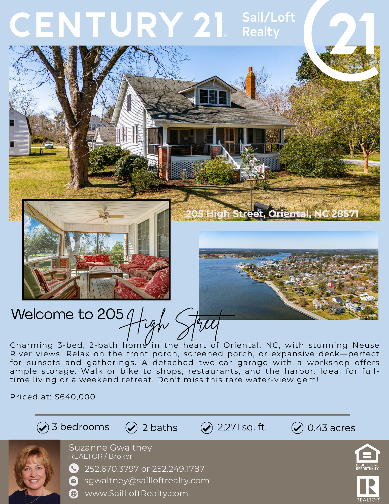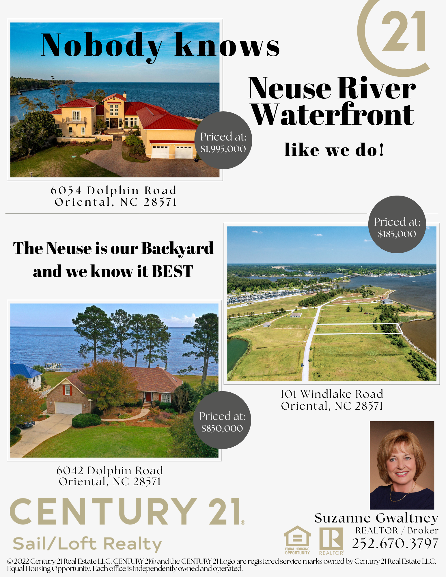 Call Suzanne Gwaltney, CRS, SRES, Realtor®/Broker at 252-670-3797 to schedule an appointment. Visit our website at www.sailloftrealty.com to view more details about this listing. |