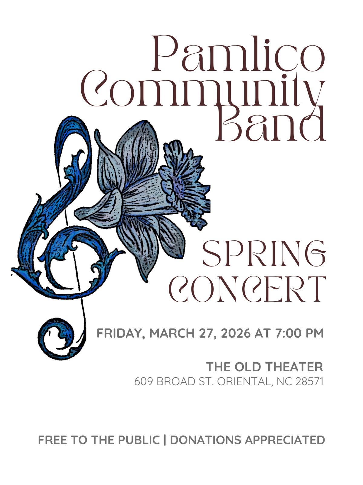 March 27 at 7p the Pamlico Community Band performs their Spring Concert at The Old Theater.