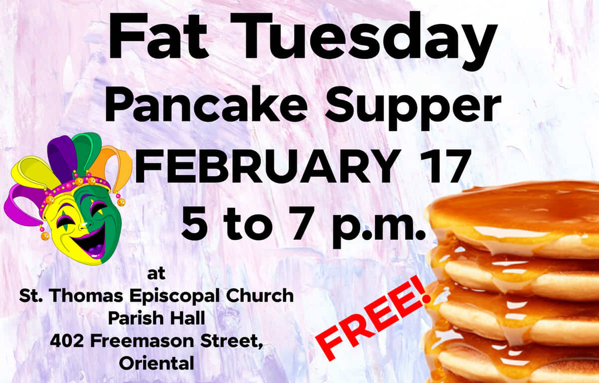 St. Thomas Episcopal Church in Oriental hosts a Fat Tuesday Pancake Supper, Feb 17 from 5 – 7p.