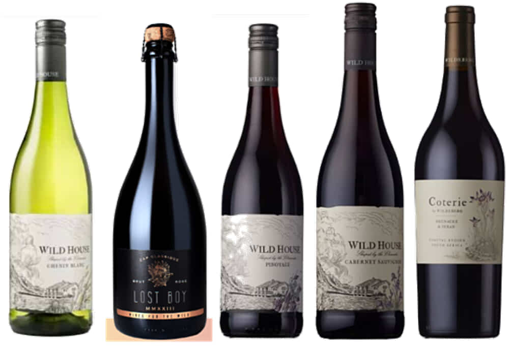 Wild House Chenin Blanc, Lost Boys Brut Rose, Wild House Pinotage, Wild House Cabernet Sauvignon, Coterie Grenache-Syrah.