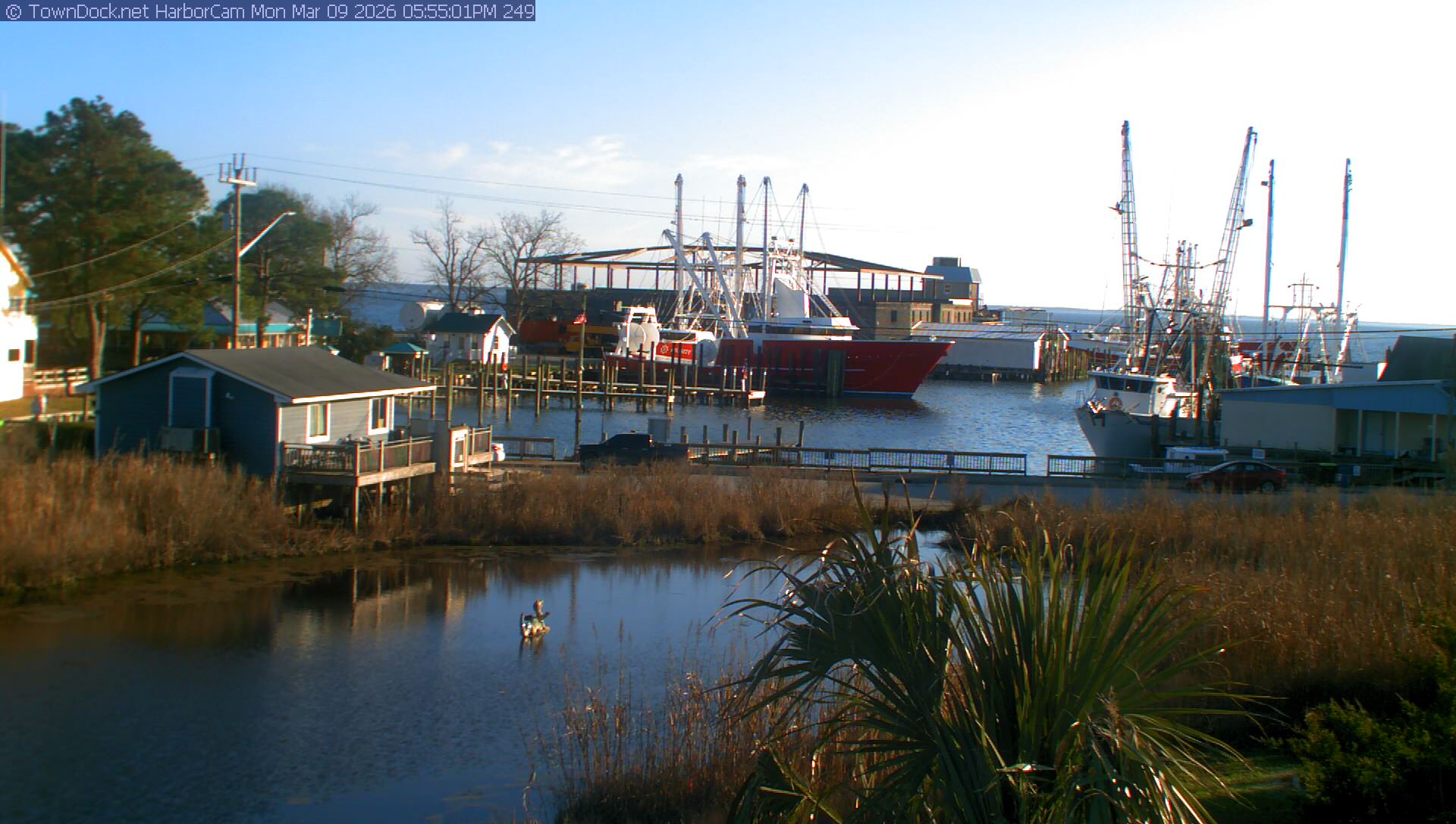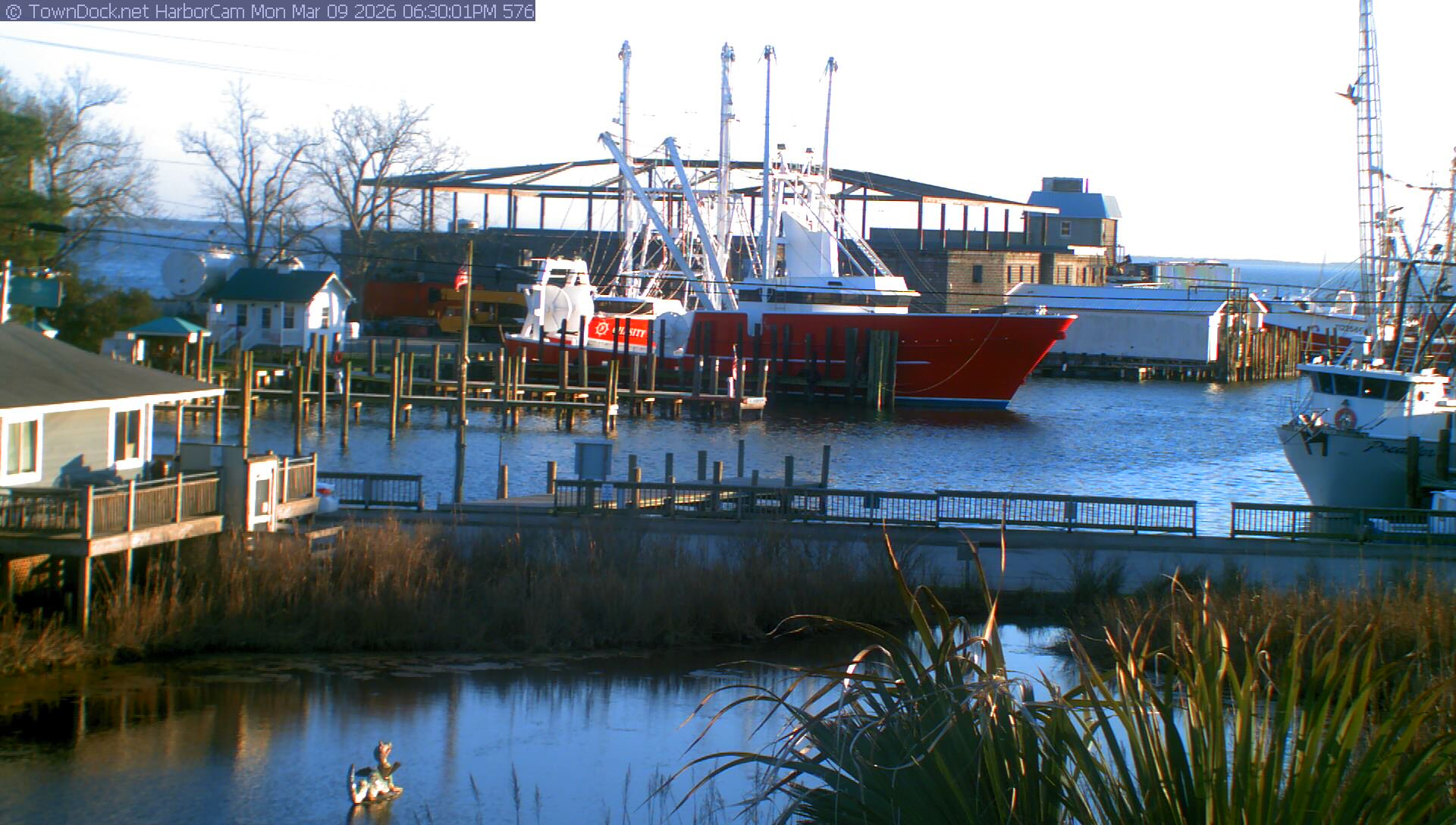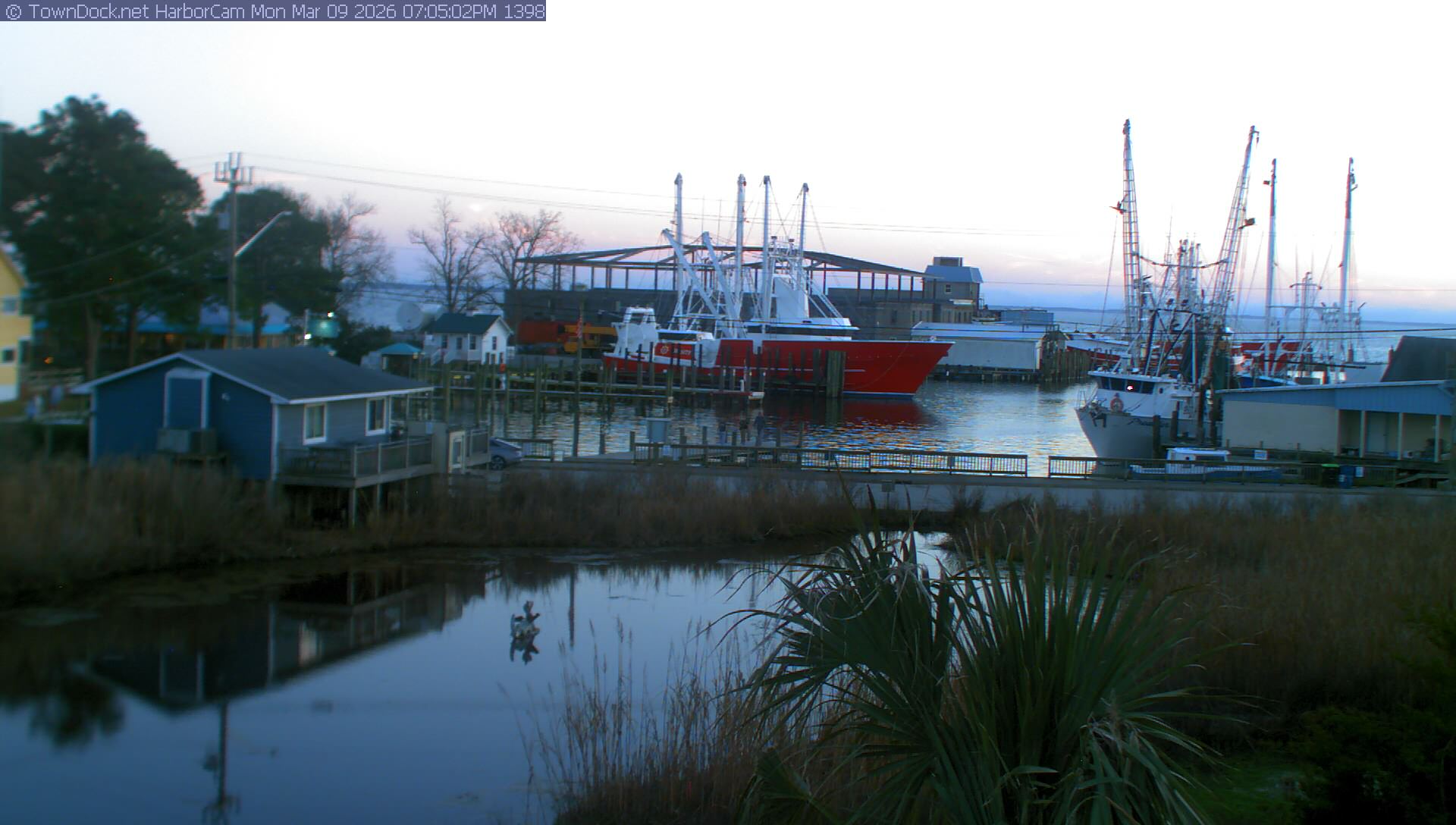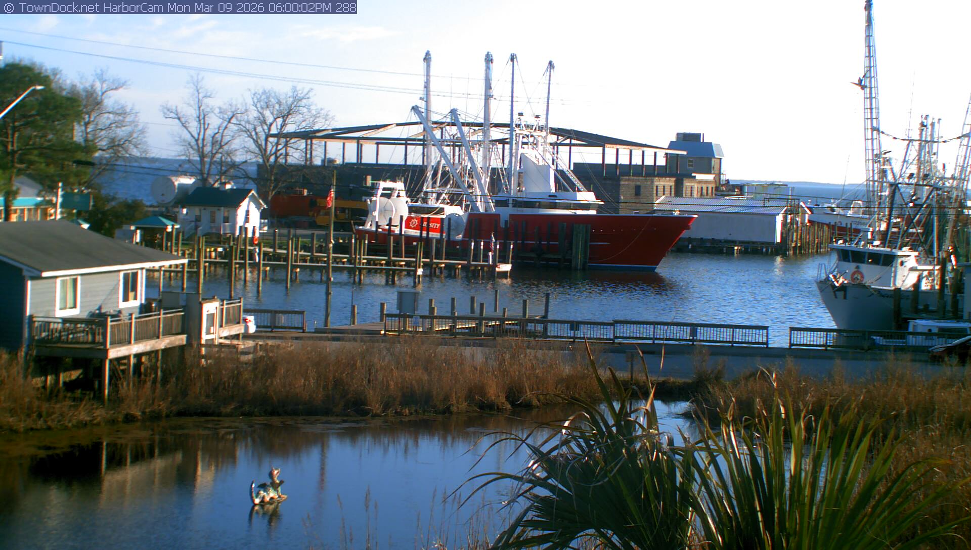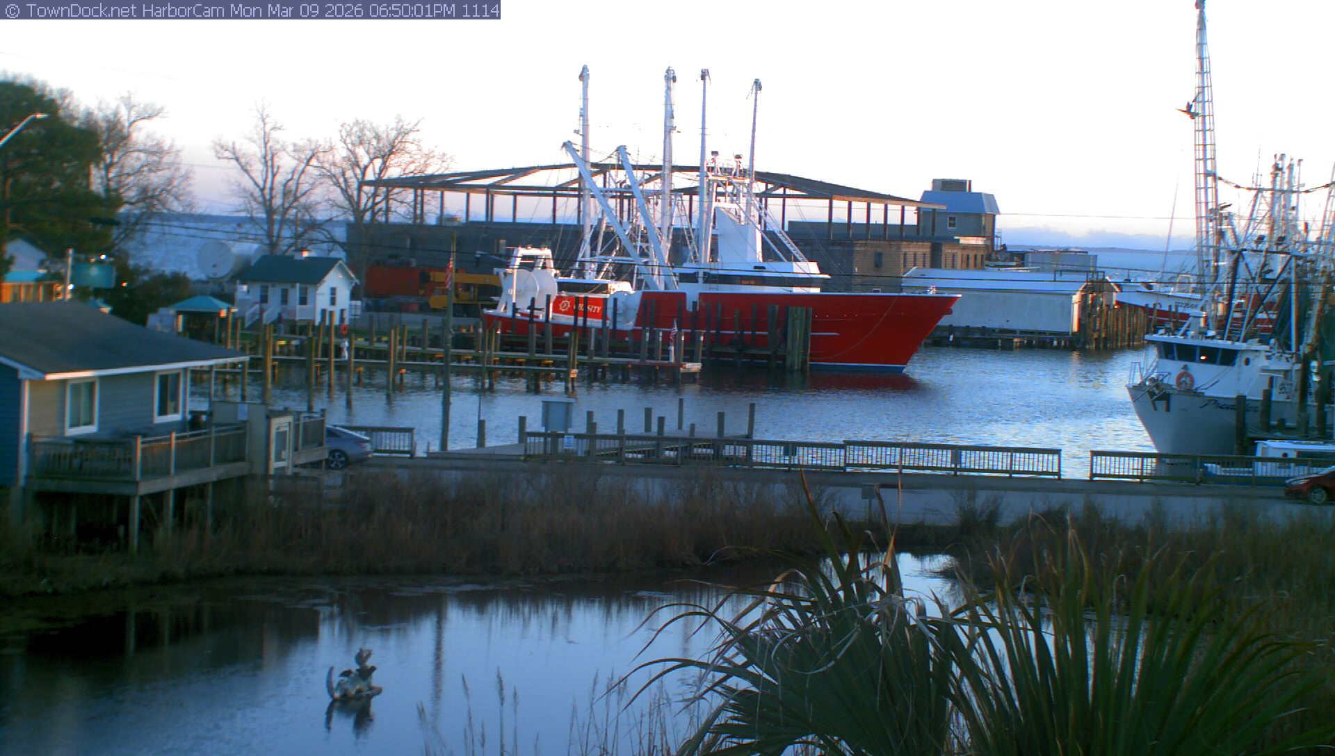 HarborCam takes a new picture of the Oriental harbor every five minutes from dawn til just before dusk. Click on the image to see a larger version. Once you see that larger version, you can click (see arrow at right) to go back in time and see recent photos. Harbor Cam currently takes photos from 6:30am to 6:00pm.