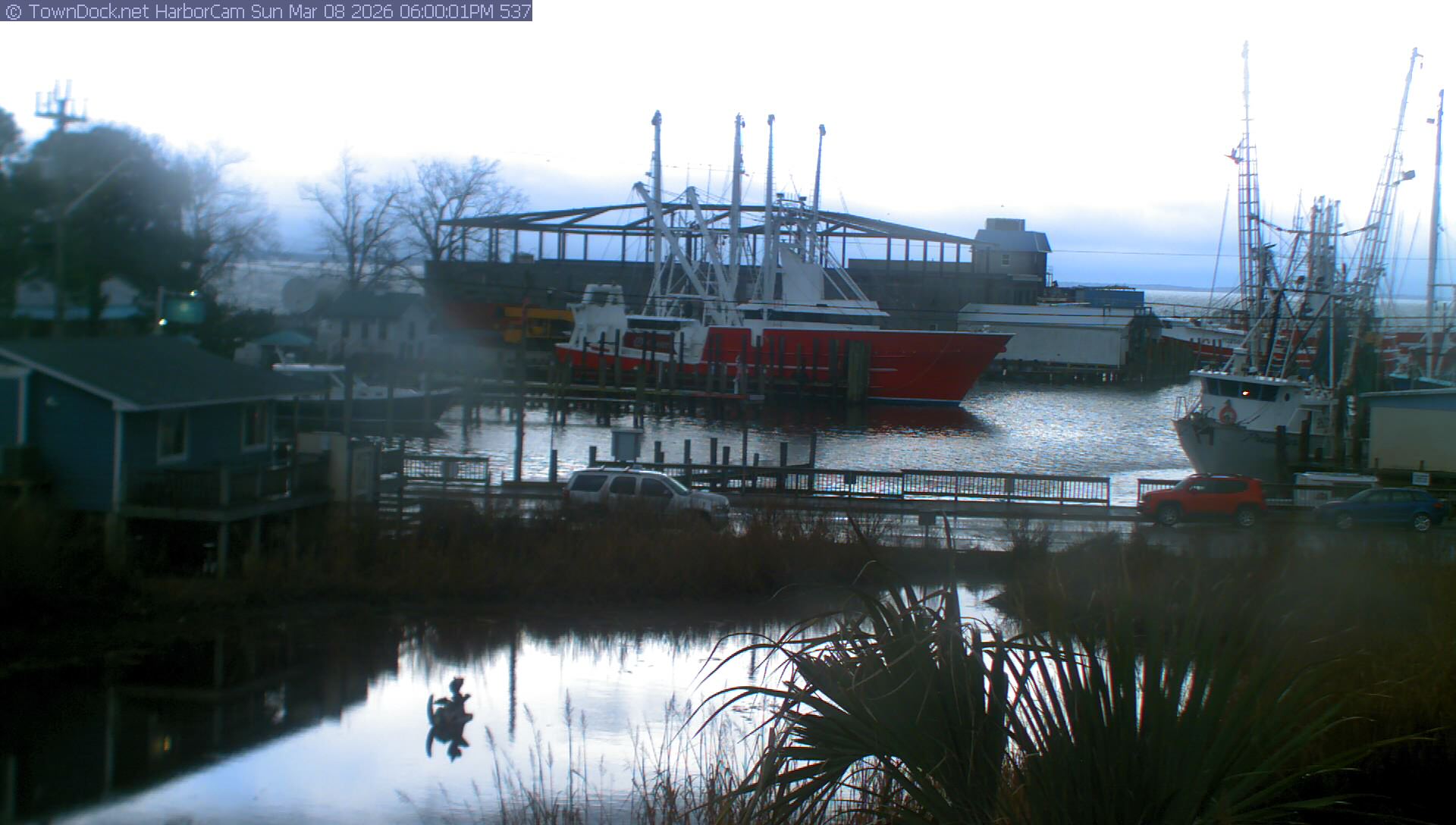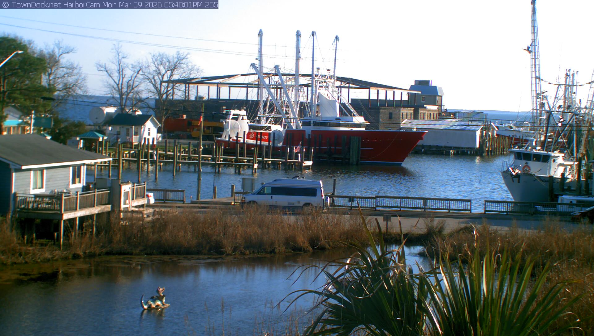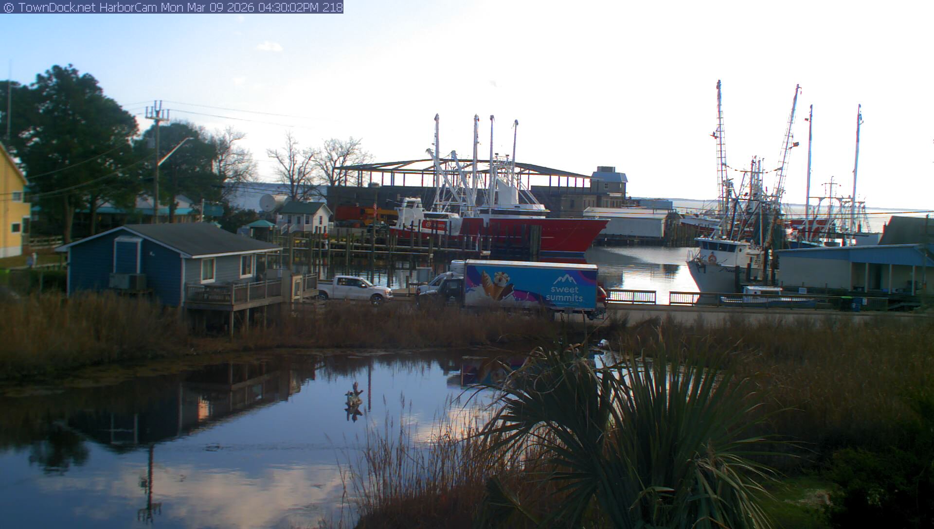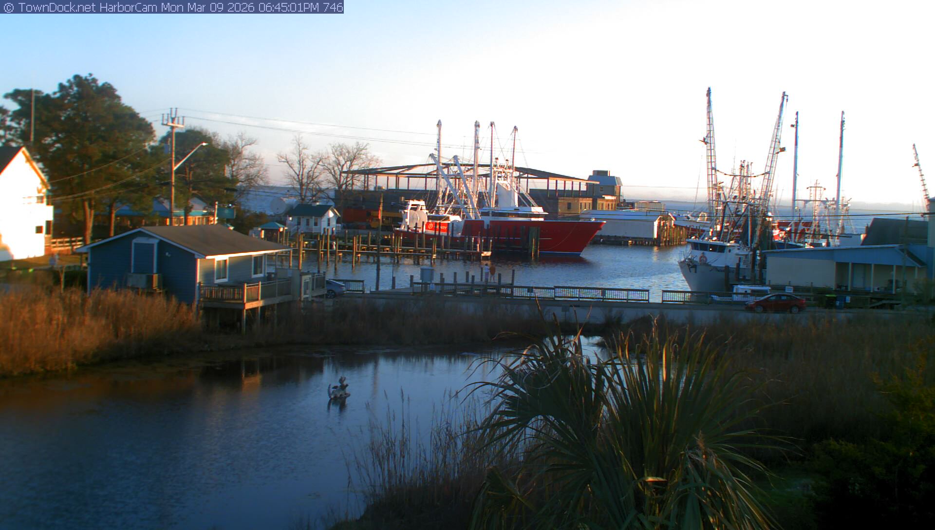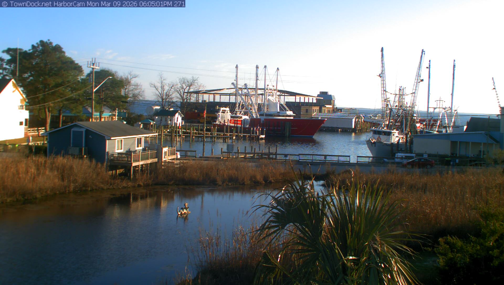 HarborCam takes a new picture of the Oriental harbor every five minutes from dawn til just before dusk. Click on the image to see a larger version. Once you see that larger version, you can click (see arrow at right) to go back in time and see recent photos. Harbor Cam currently takes photos from 6:30am to 6:00pm.
