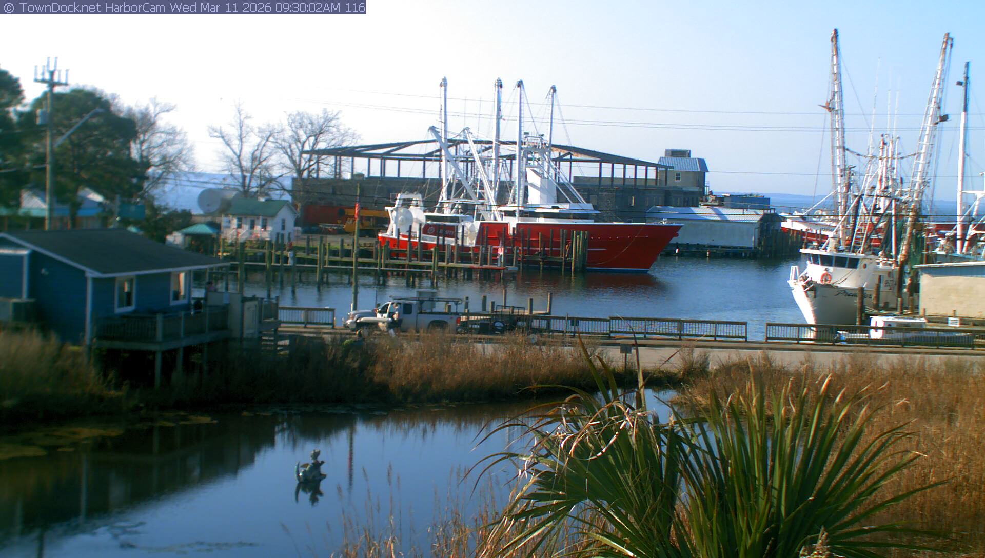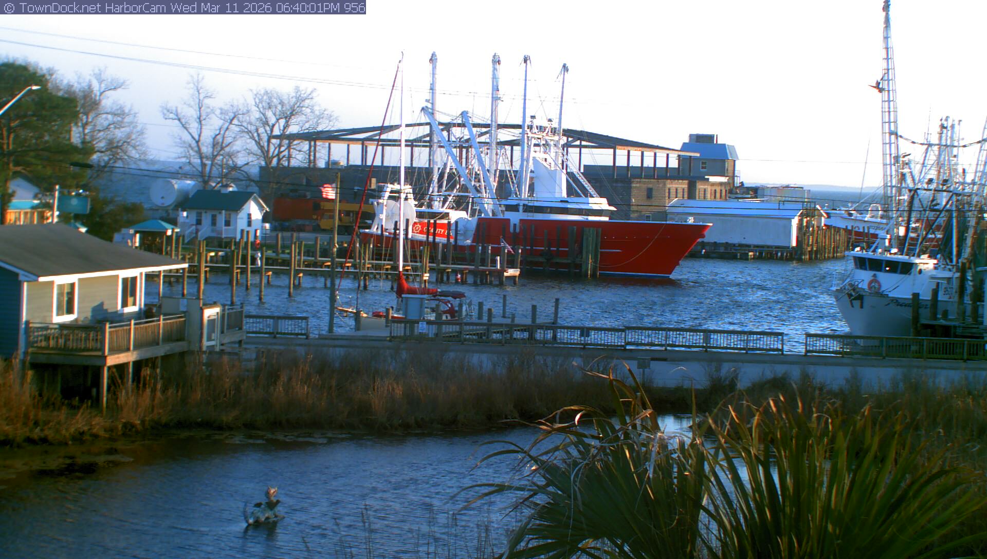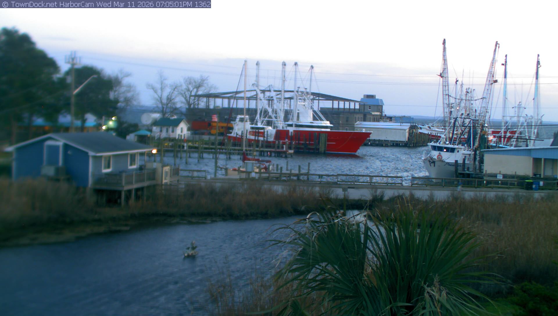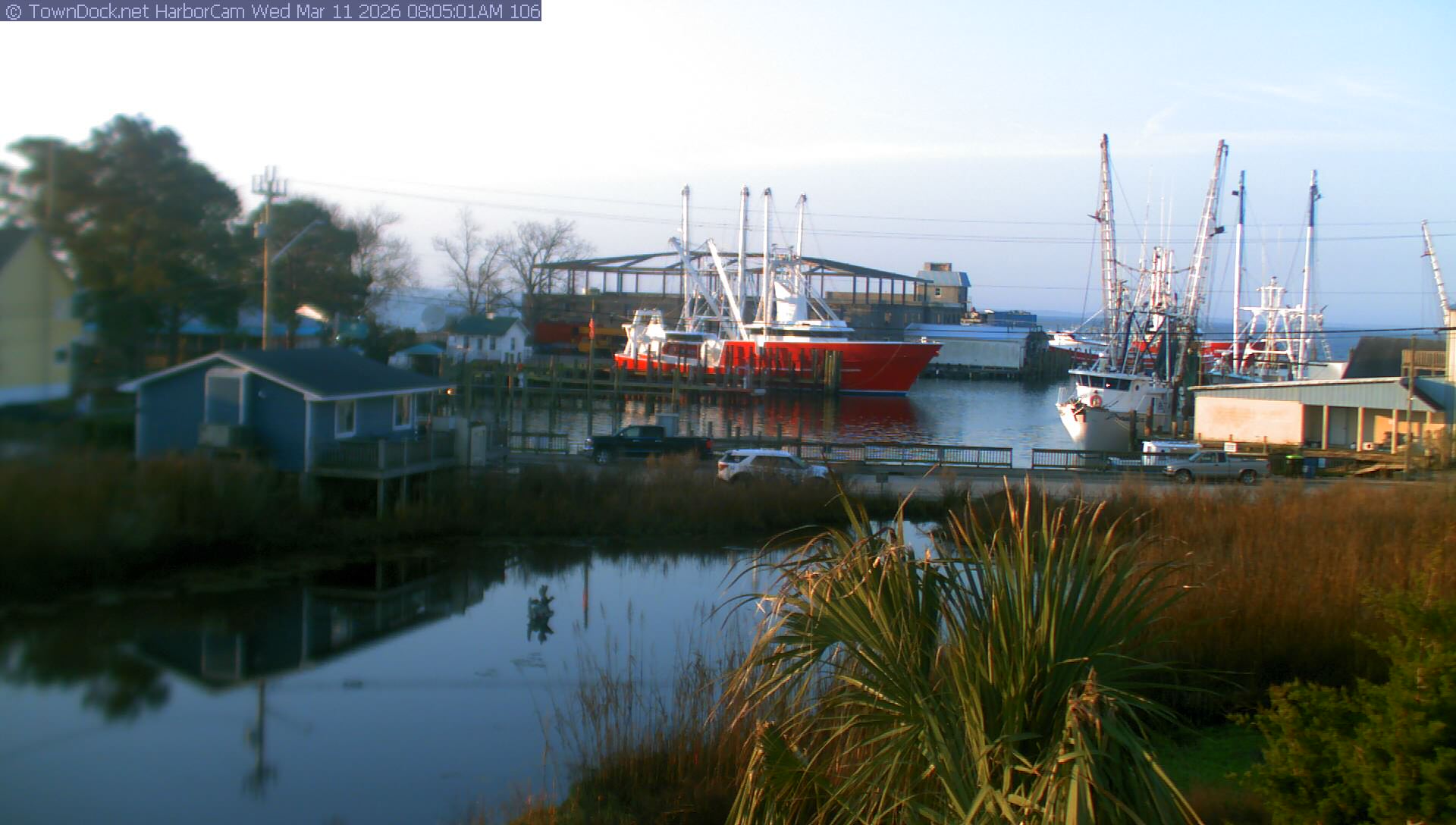 HarborCam takes a new picture of the Oriental harbor every five minutes from dawn til just before dusk. Click on the image to see a larger version. Once you see that larger version, you can click (see arrow at right) to go back in time and see recent photos. Harbor Cam currently takes photos from 6:30am to 6:00pm.