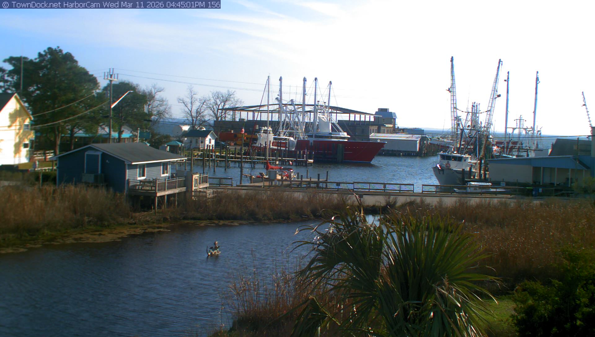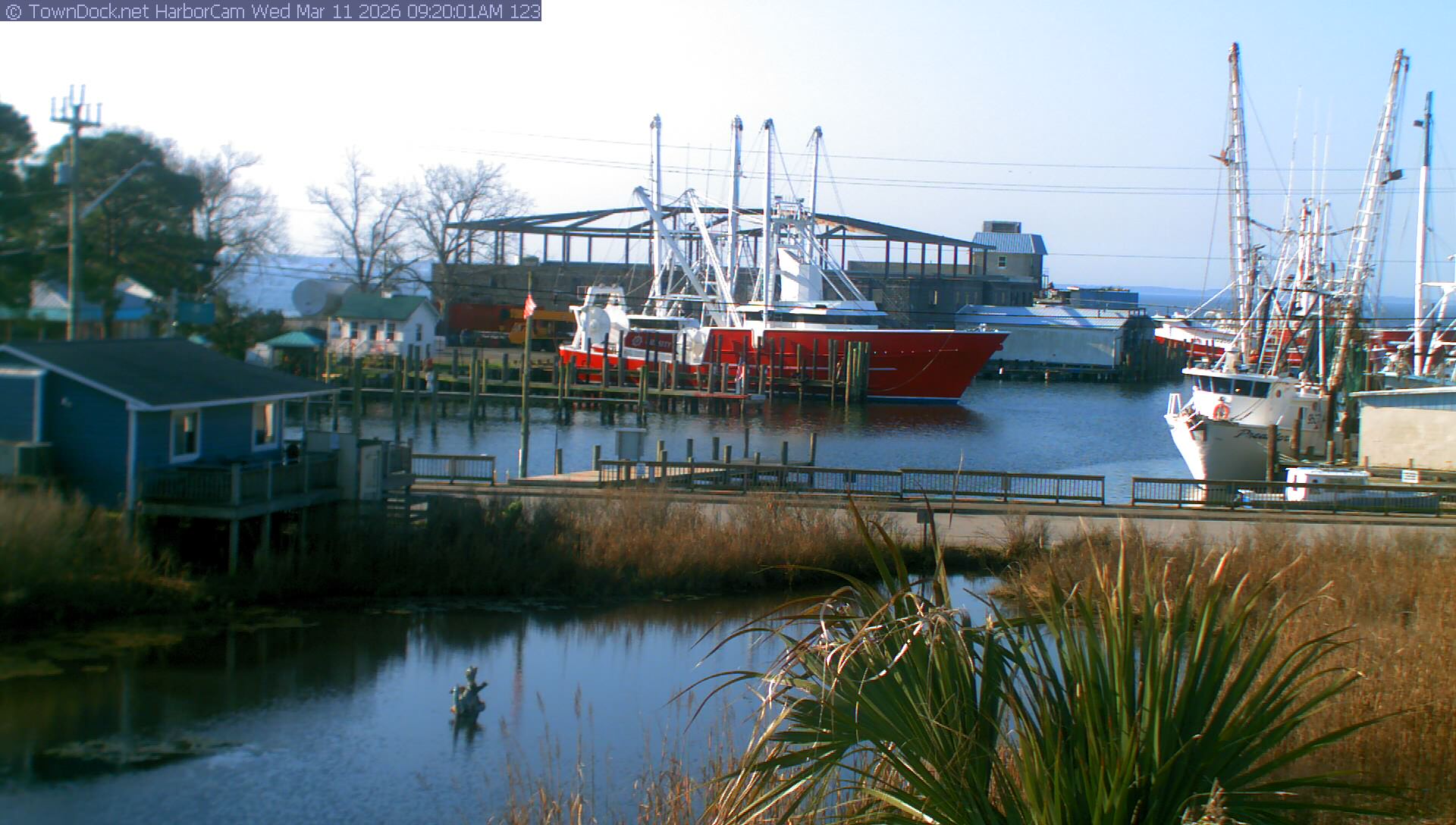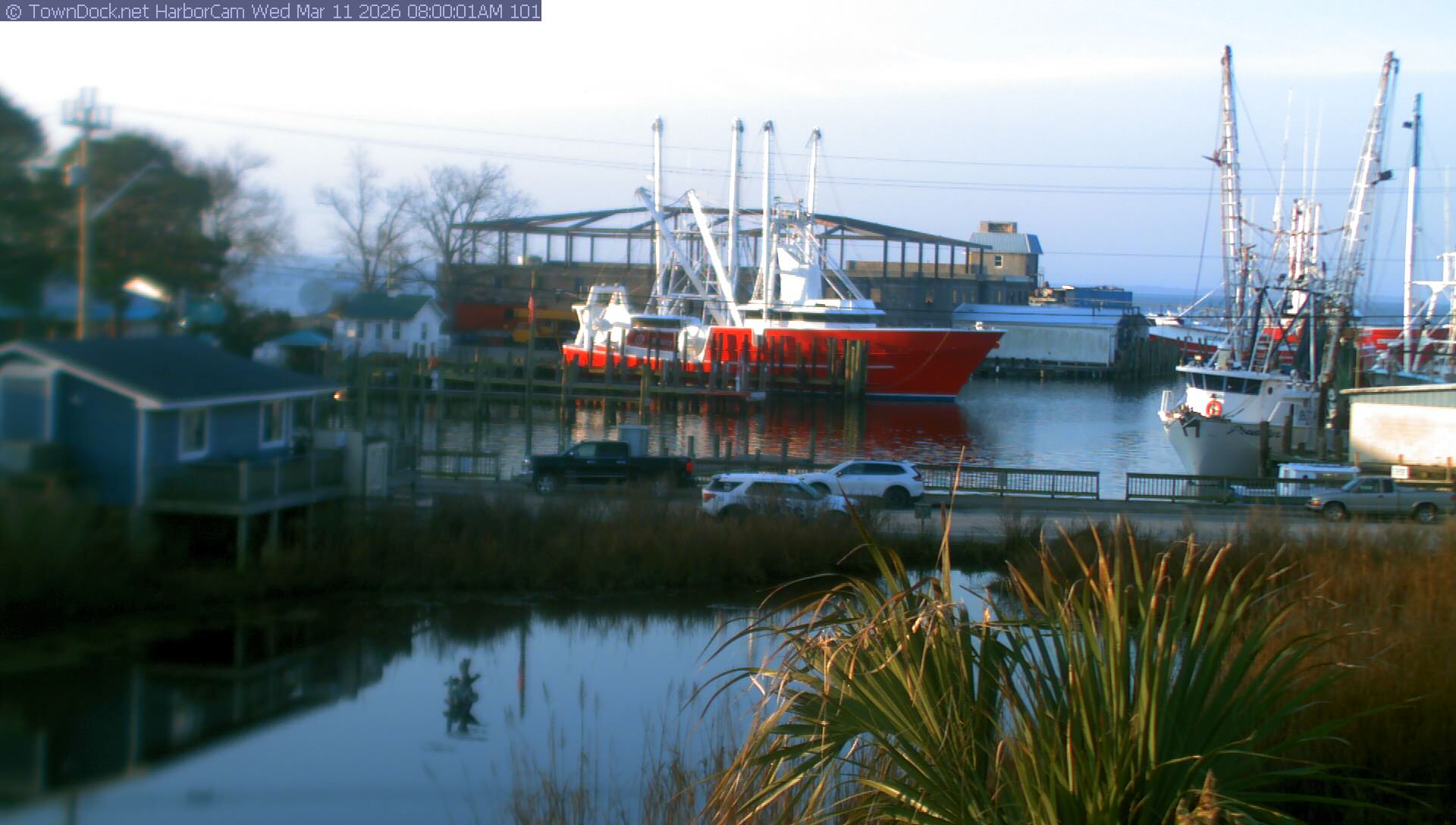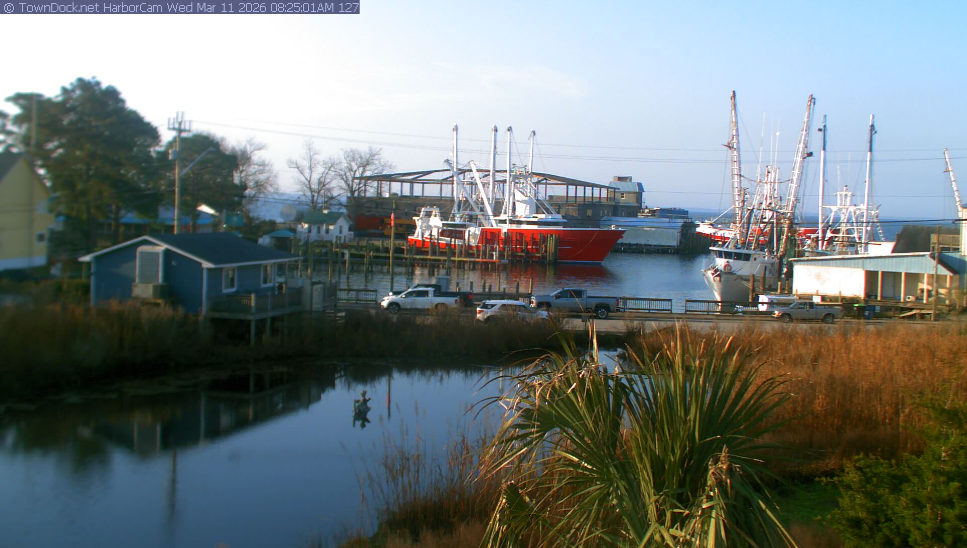 HarborCam takes a new picture of the Oriental harbor every five minutes from dawn til just before dusk. Click on the image to see a larger version. Once you see that larger version, you can click (see arrow at right) to go back in time and see recent photos. Harbor Cam currently takes photos from 6:30am to 6:00pm.