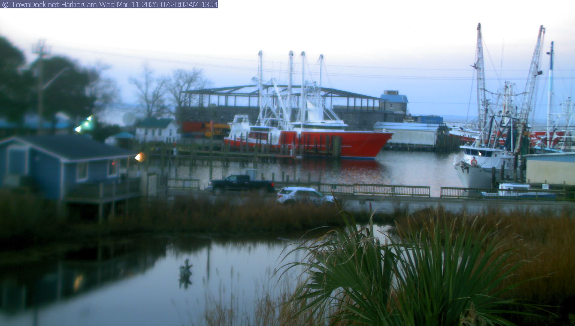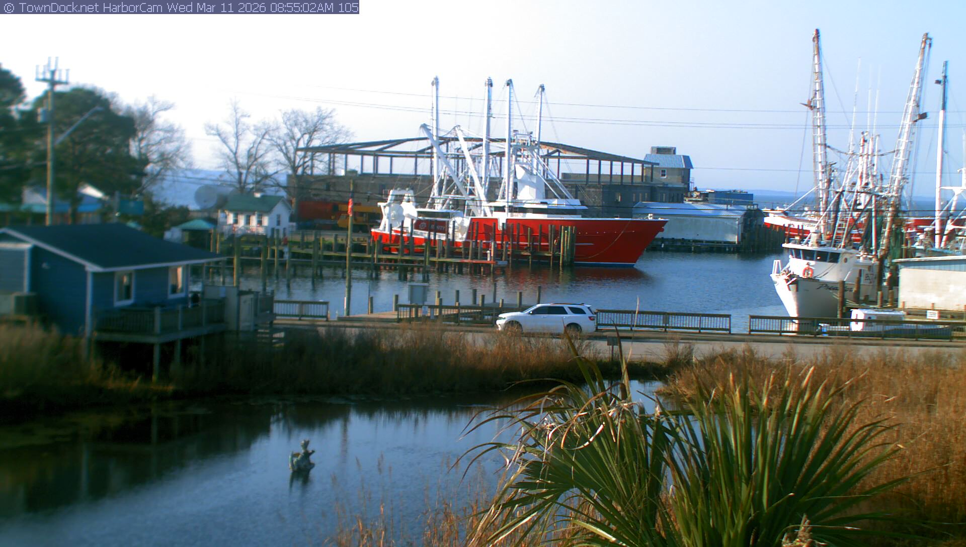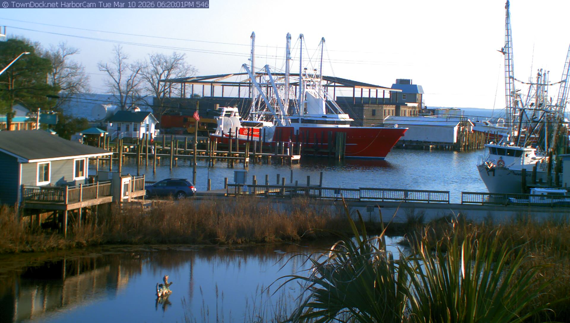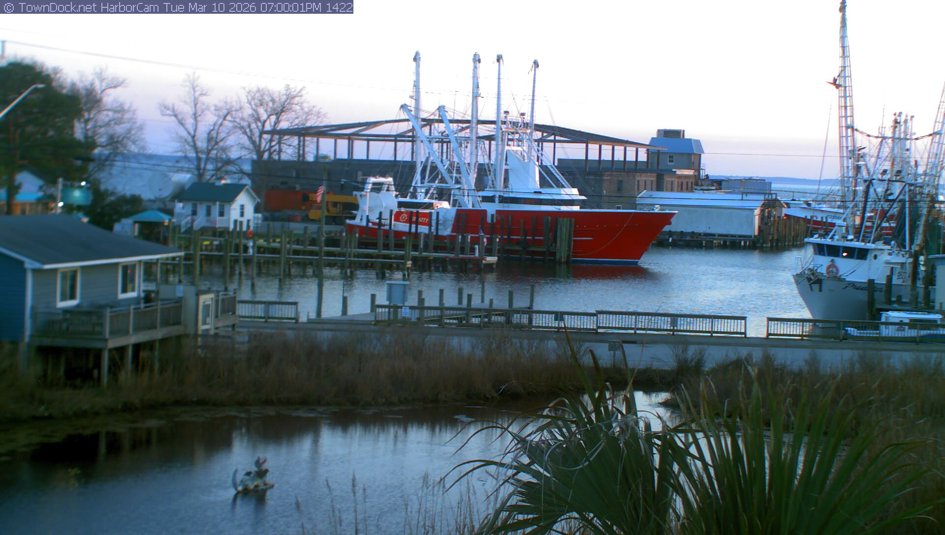 HarborCam takes a new picture of the Oriental harbor every five minutes from dawn til just before dusk. Click on the image to see a larger version. Once you see that larger version, you can click (see arrow at right) to go back in time and see recent photos. Harbor Cam currently takes photos from 6:30am to 6:00pm.