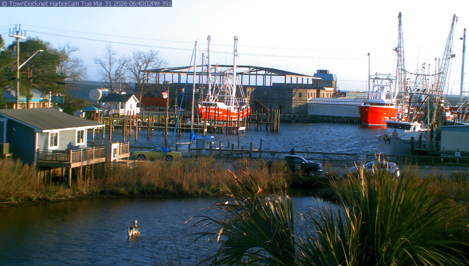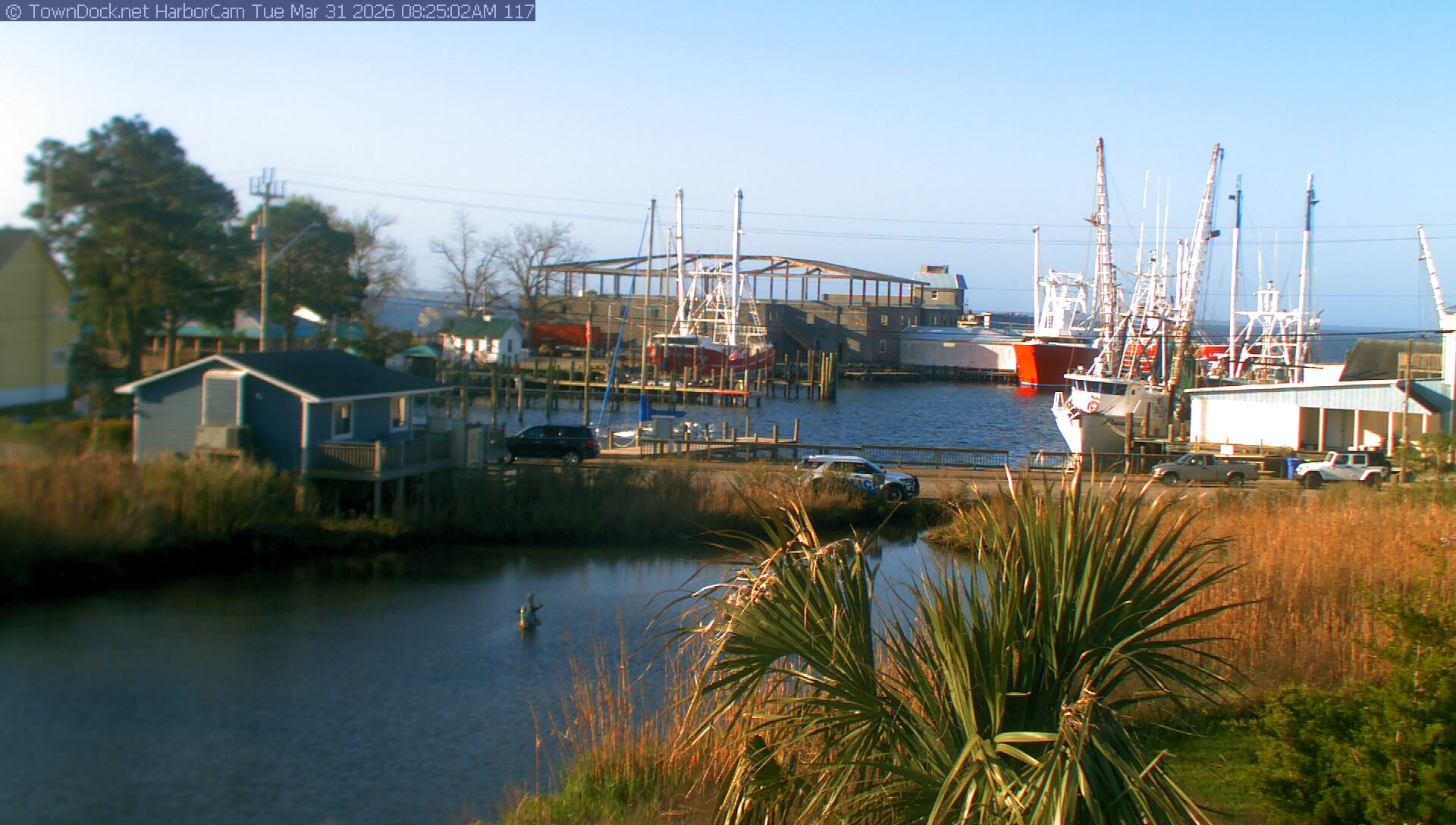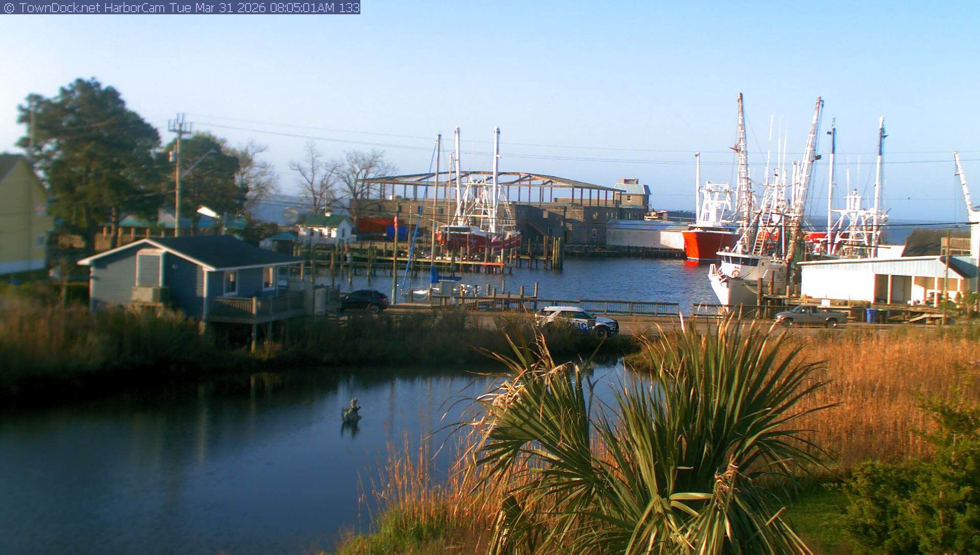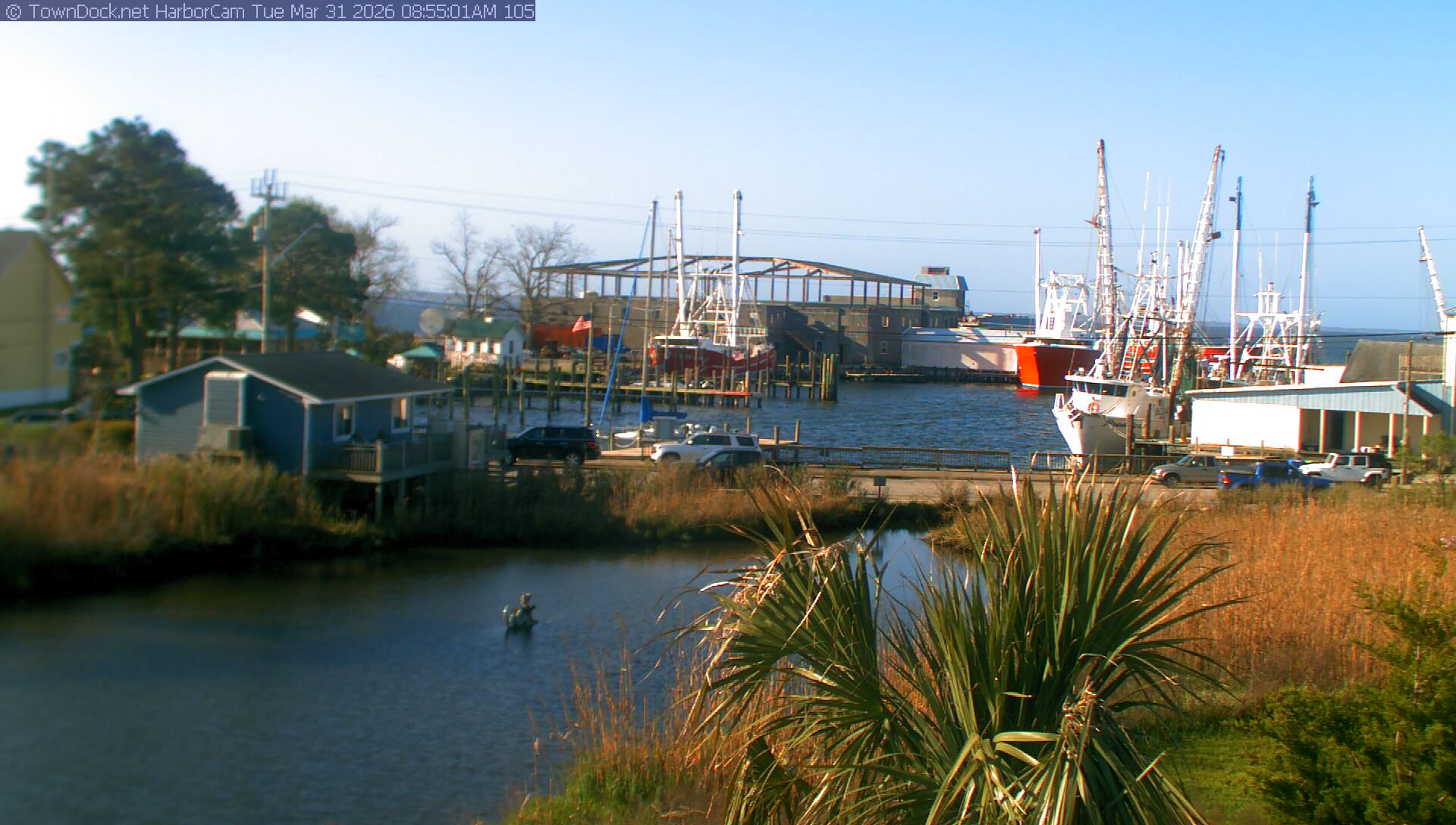 HarborCam takes a new picture of the Oriental harbor every five minutes from dawn til just before dusk. Click on the image to see a larger version. Once you see that larger version, you can click (see arrow at right) to go back in time and see recent photos. Harbor Cam currently takes photos from 7:00am to 7:00pm.