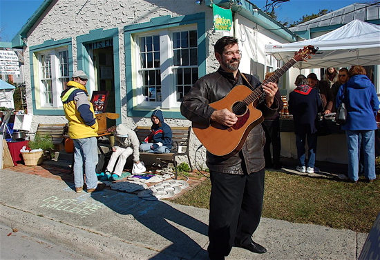 Eben Crowe performing at the Farmers’ Market in December. His alter ego, Bob Laverty has started offering up vegetables from Bob’s Gardens in the Spring of 2009.