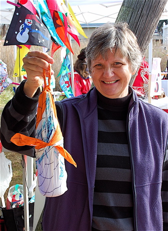 Jayne Stasser demonstrates “Furoshiki”, the Japanese art of giftwrapping with fabric. It’s in keeping with Jayne’s efforts toward using less plastic. She sells — at cost and no profit to herself — garbage and other bags made of more bio-degradeable corn.