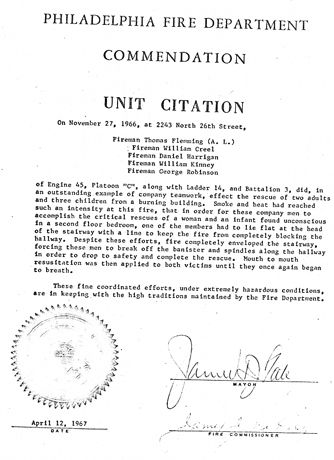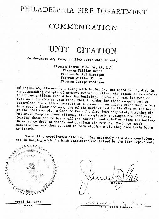 A commendation to Bill Creel and other firefighters who saved the lives of five people in a 1966 fire.After a quarter century with the Philadelphia Fire Department and rising to the rank of Lieutenant, Bill retired. But not for long. He went on to work another 18 years as the fire marshal at Allentown State Hospital.