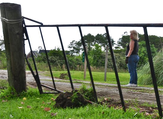 Testing the rubrail.Somehow, the trailer veered even closer to the edge of the edge of the ditch, pushing aside some pilings.