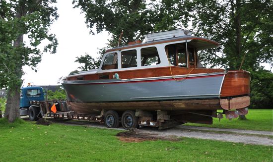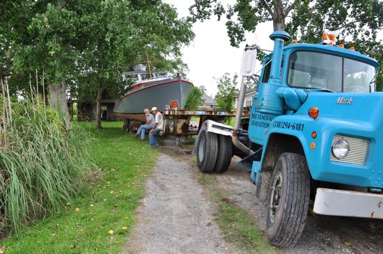 A few attempts were made to get the trailer and the Mathews 40’ stock cruiser in to the driveway. With Royce Anderson at the steering wheel, the trailer and boat were backed in.