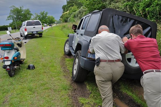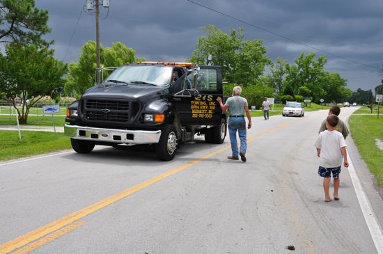 One or two vehicles did try to pass on the shoulder which was extremely soft given all the rain of late. One jeep got mired in the soggy ditch along that side of the road. Paul Welles, a professional boat hauler who happened to be coming from the other direction, hitched the jeep to his truck. Along with some pushing, the jeep got free.