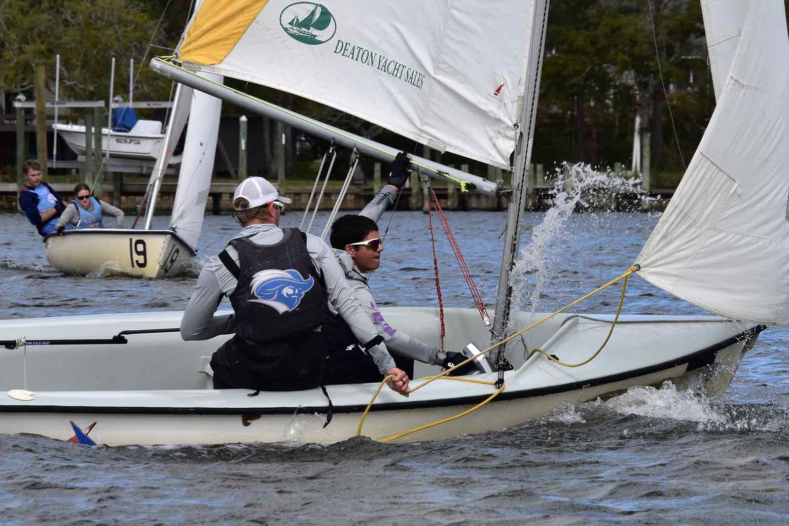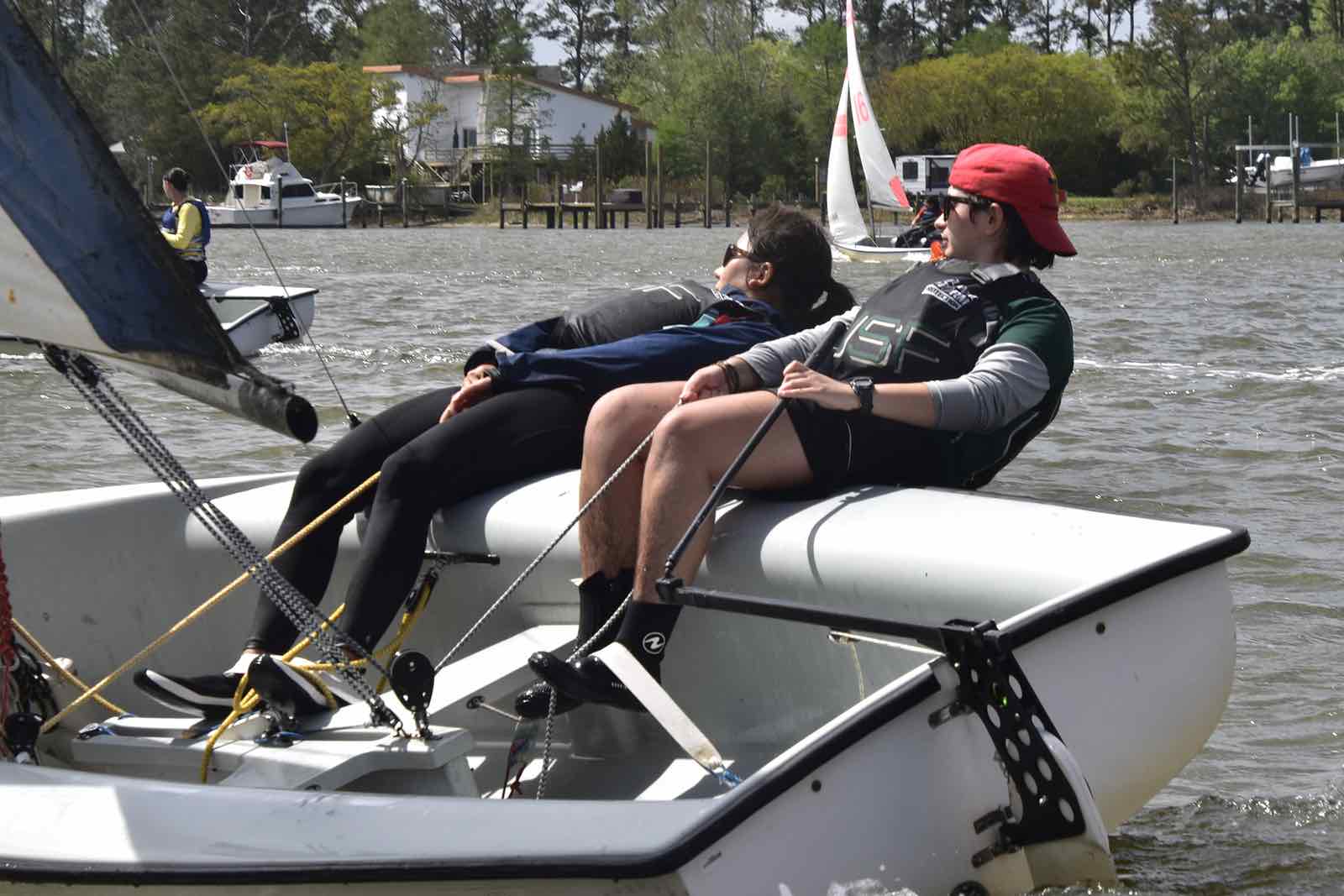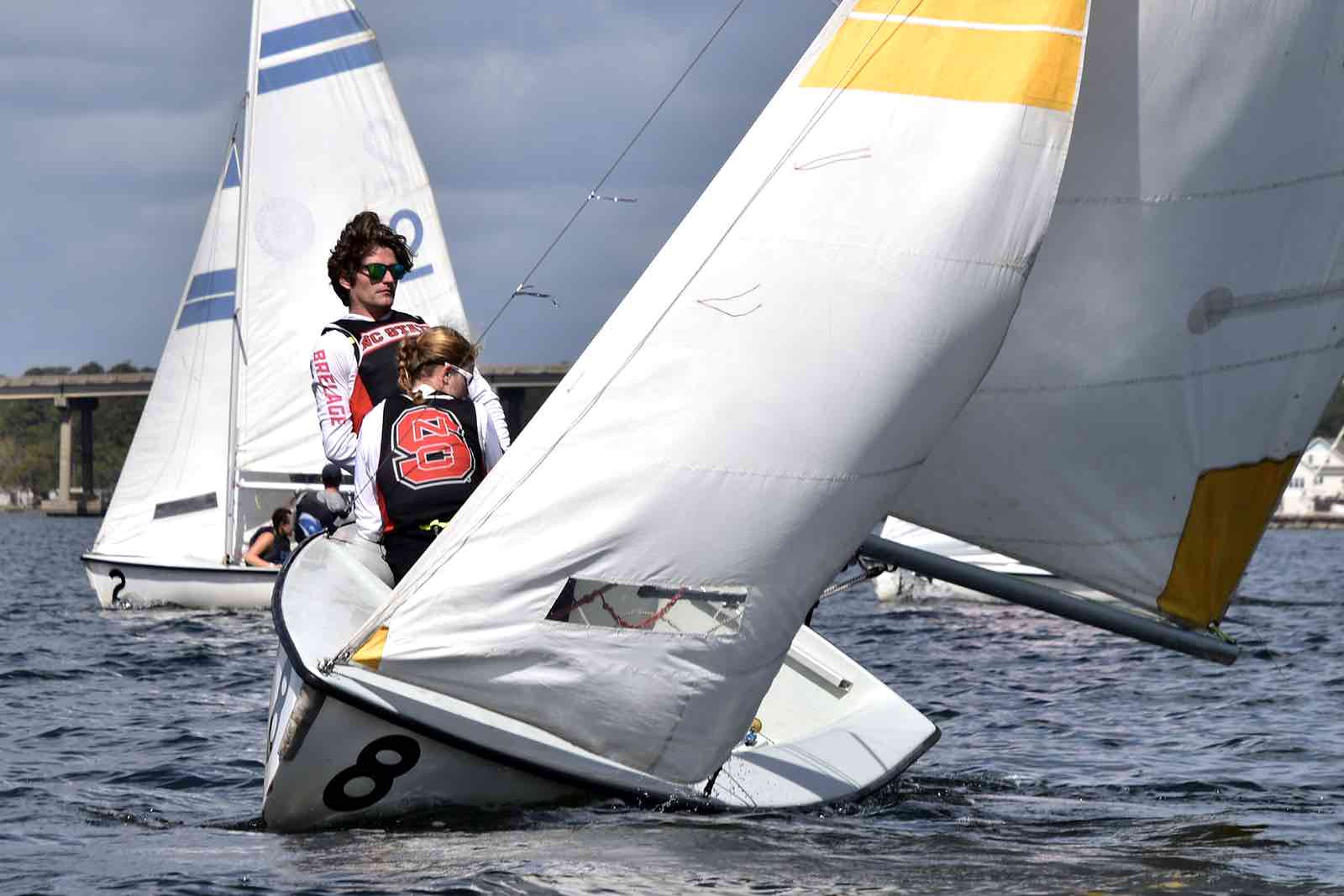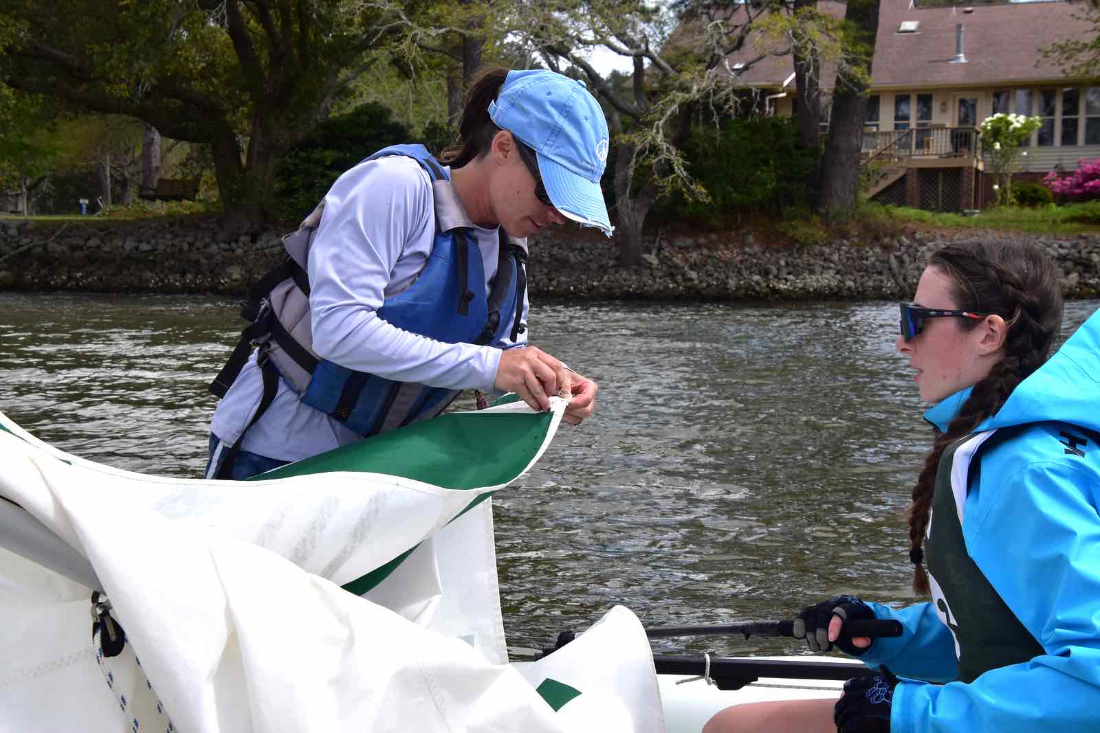 Alexis Lutz of Bow to Stern sews a in a replacement batten as the race continues around her and the crew.By the end of the race, hosts NC State secured first place with Canadian visitors Queen’s University in Kingston, Ontario – called the Queen’s Gaels or sometimes Queen’s Sailing – taking second place. The Jacksonville Fins came in third.