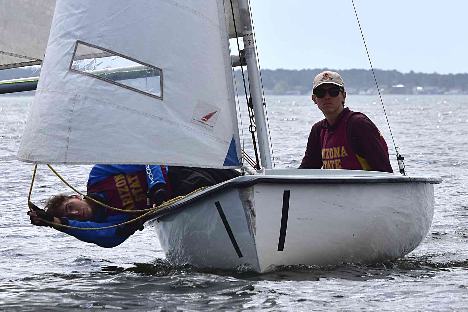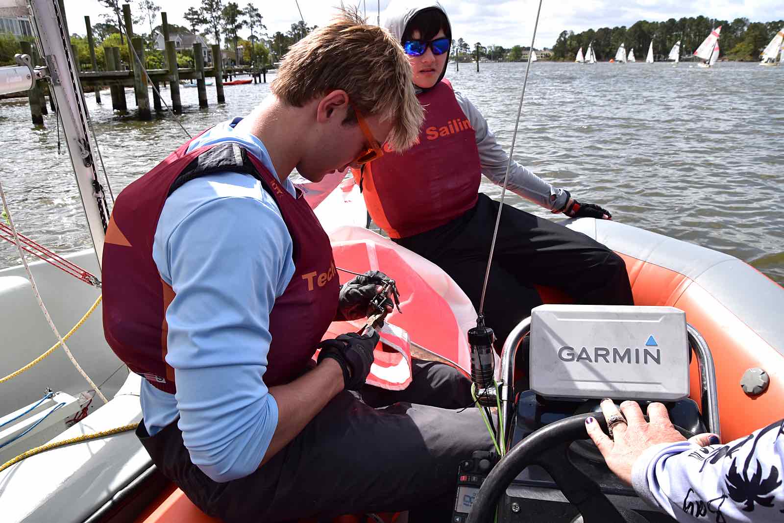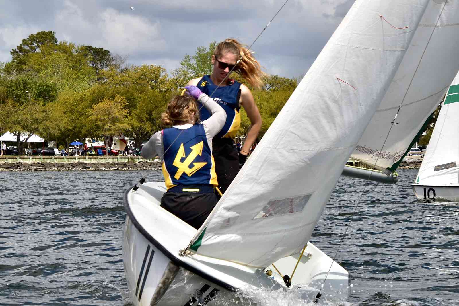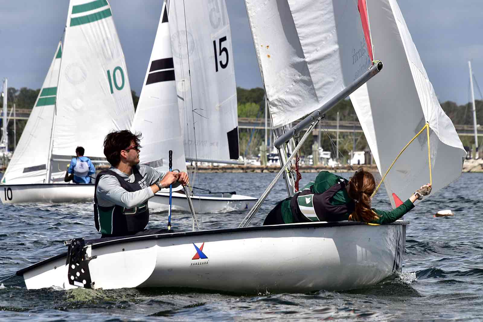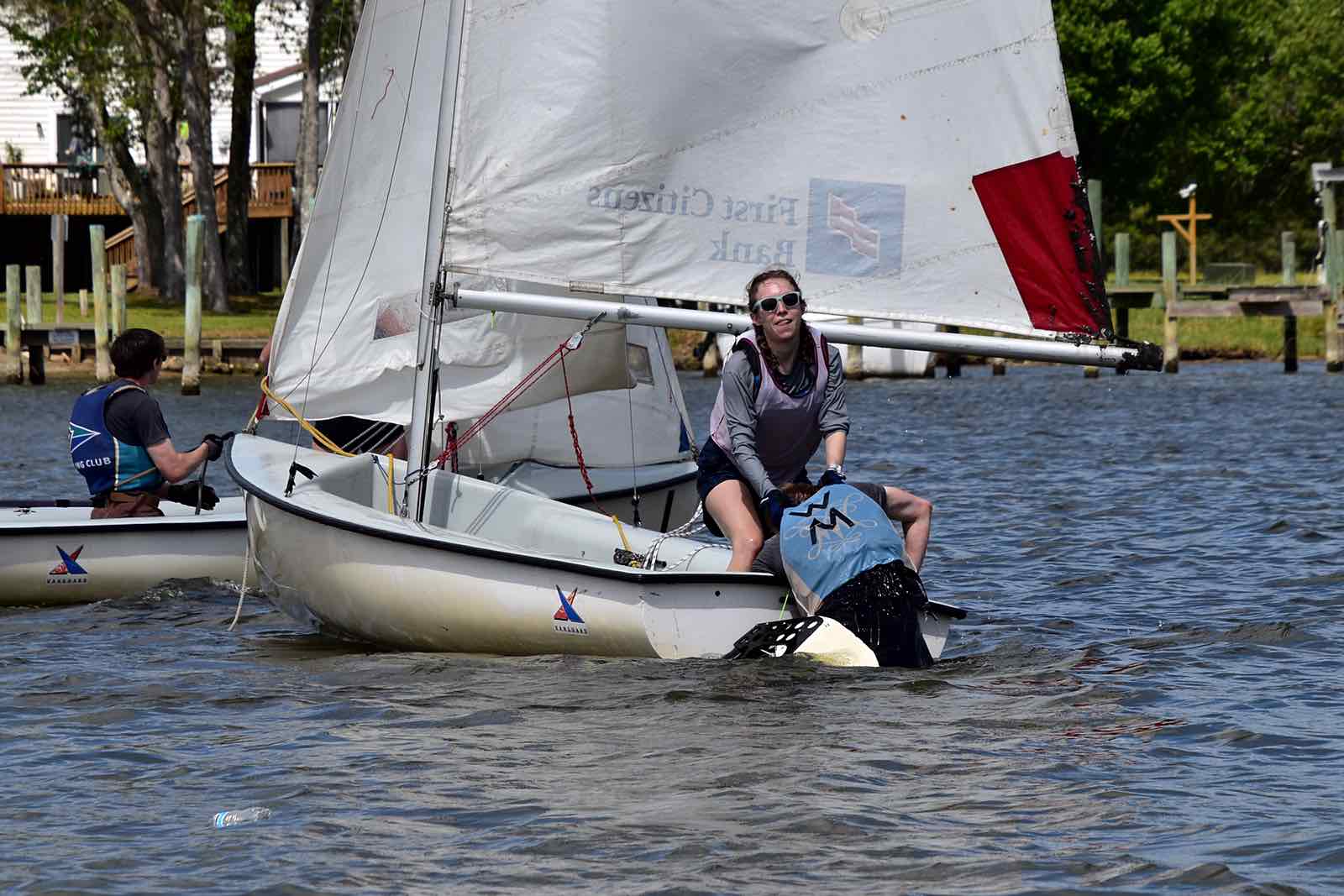 Alexis Lutz of Bow to Stern sews a in a replacement batten as the race continues around her and the crew.By the end of the race, hosts NC State secured first place with Canadian visitors Queen’s University in Kingston, Ontario – called the Queen’s Gaels or sometimes Queen’s Sailing – taking second place. The Jacksonville Fins came in third.