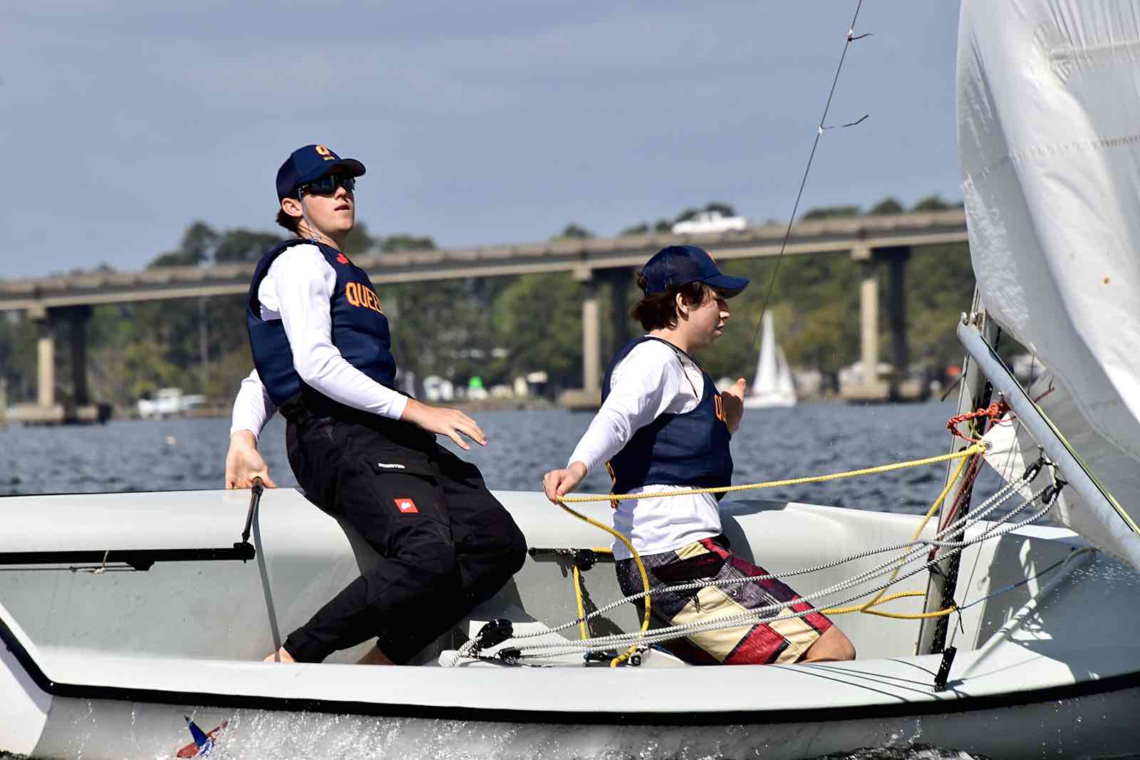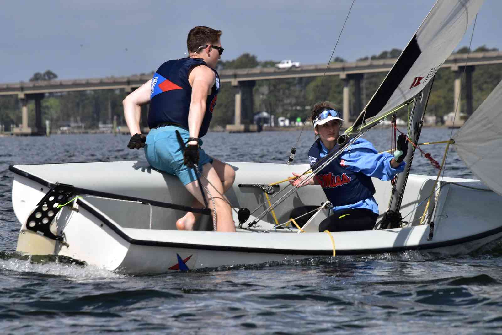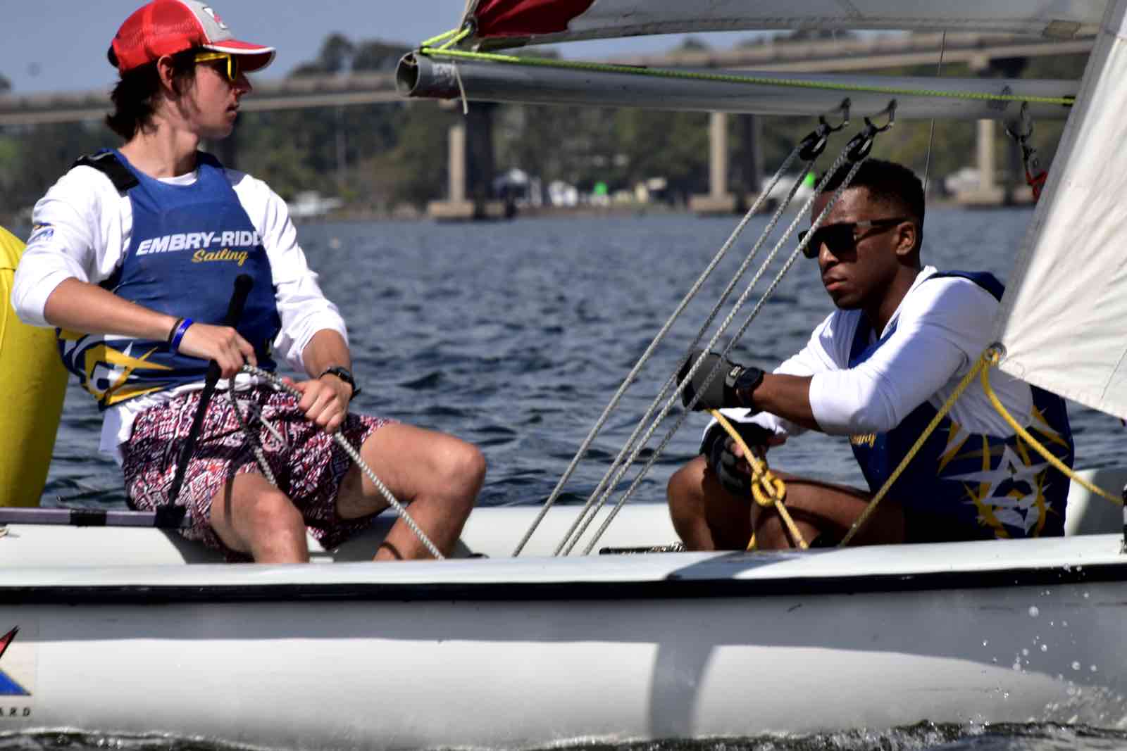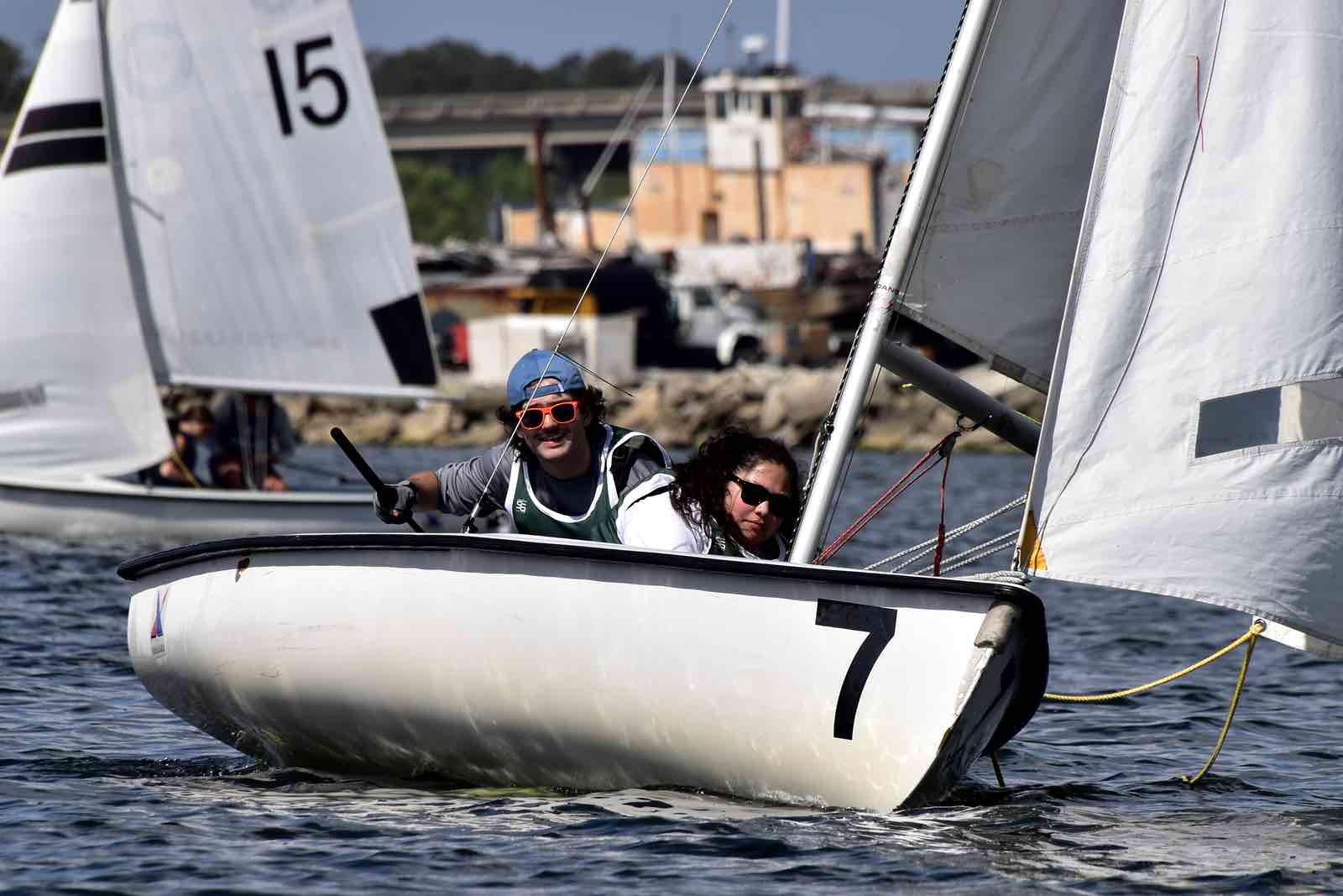 Alexis Lutz of Bow to Stern sews a in a replacement batten as the race continues around her and the crew.By the end of the race, hosts NC State secured first place with Canadian visitors Queen’s University in Kingston, Ontario – called the Queen’s Gaels or sometimes Queen’s Sailing – taking second place. The Jacksonville Fins came in third.