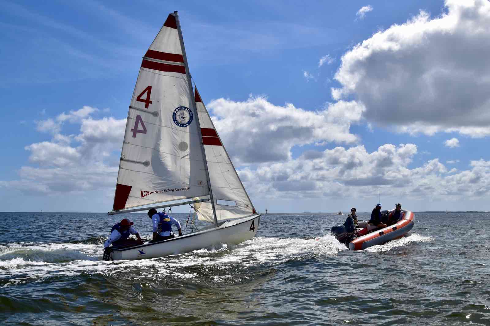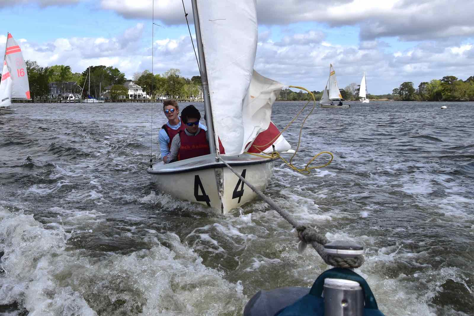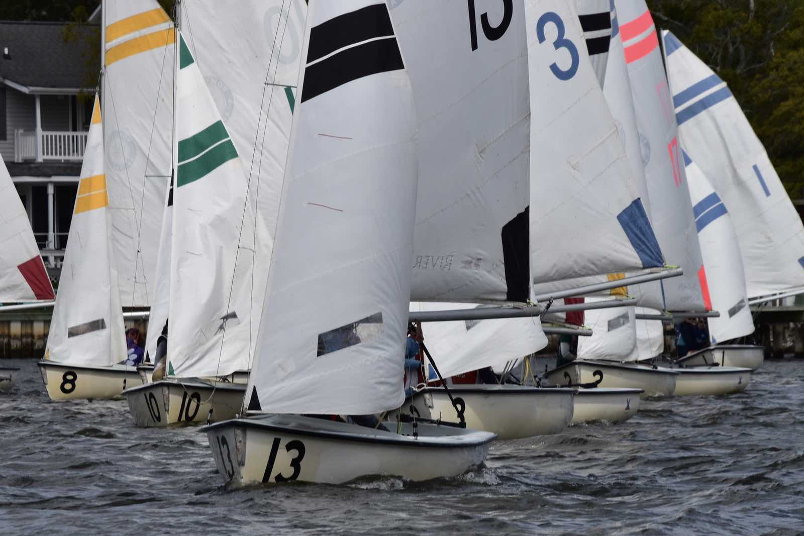The Committee Boat helping out, Saturday on the Neuse.Embry-Riddle bail out their boat. The number 4 hull had a leak and was taking on water.Sailing downwind in light air Saturday.Clockwise from top: University of Florida, Christopher Newport University, Rice University.Crowded race start in the creek Sunday.What it’s like to get 19 boats and crew from shore to creek, in 55 sped-up seconds: