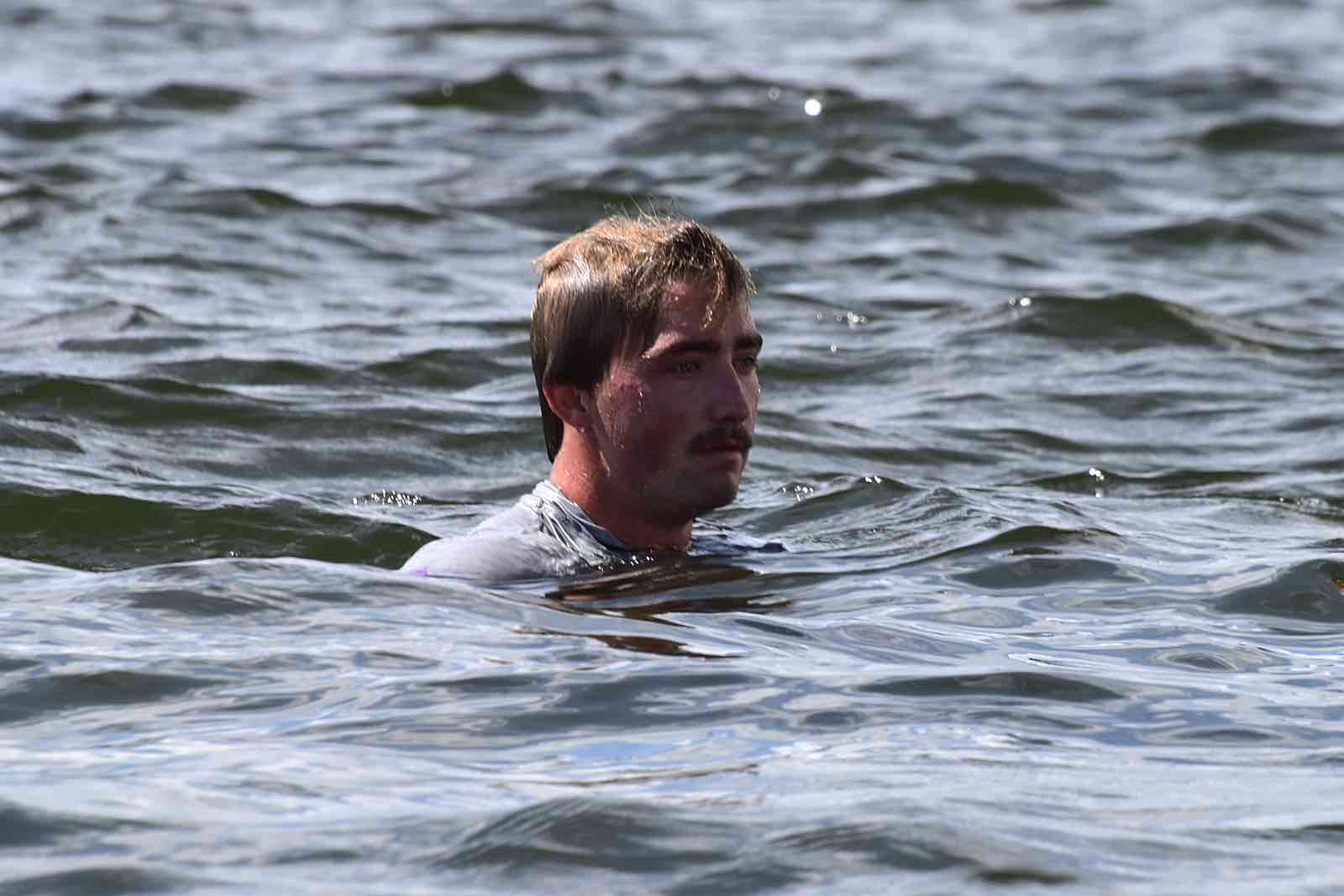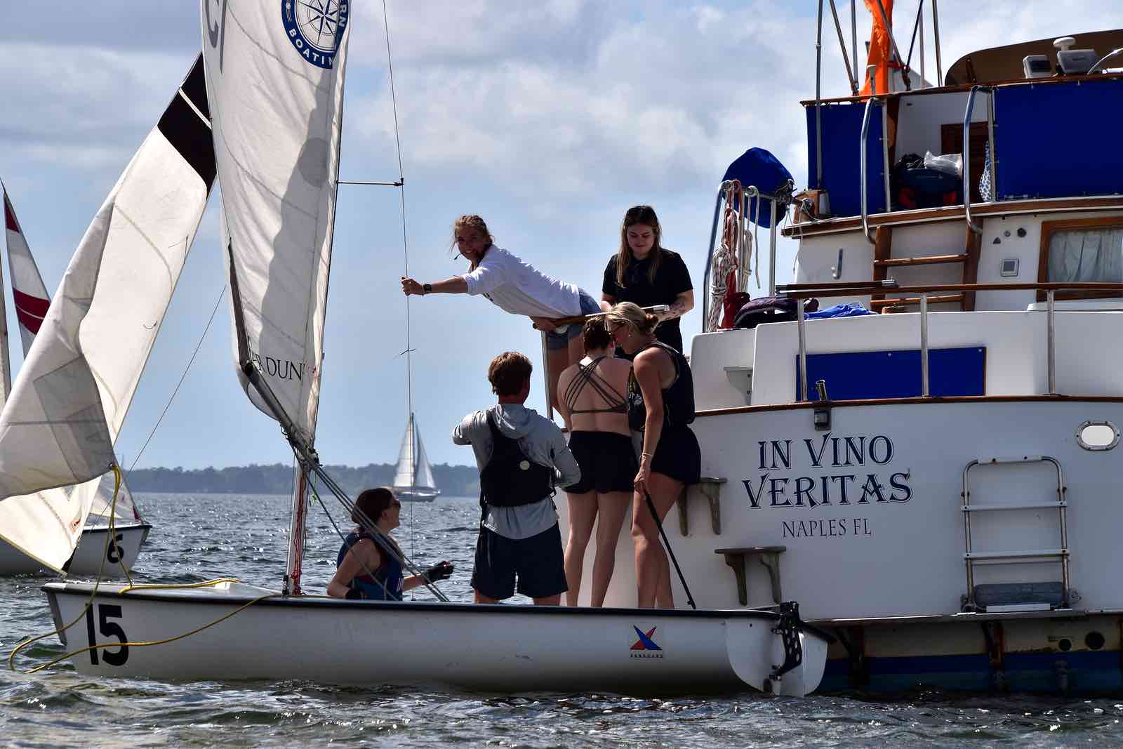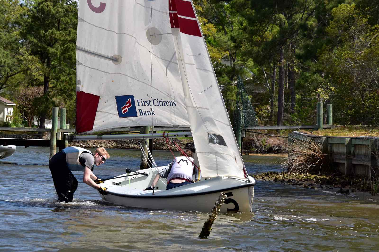The Committee Boat helping out, Saturday on the Neuse.Embry-Riddle bail out their boat. The number 4 hull had a leak and was taking on water.Sailing downwind in light air Saturday.Clockwise from top: University of Florida, Christopher Newport University, Rice University.Crowded race start in the creek Sunday.What it’s like to get 19 boats and crew from shore to creek, in 55 sped-up seconds: