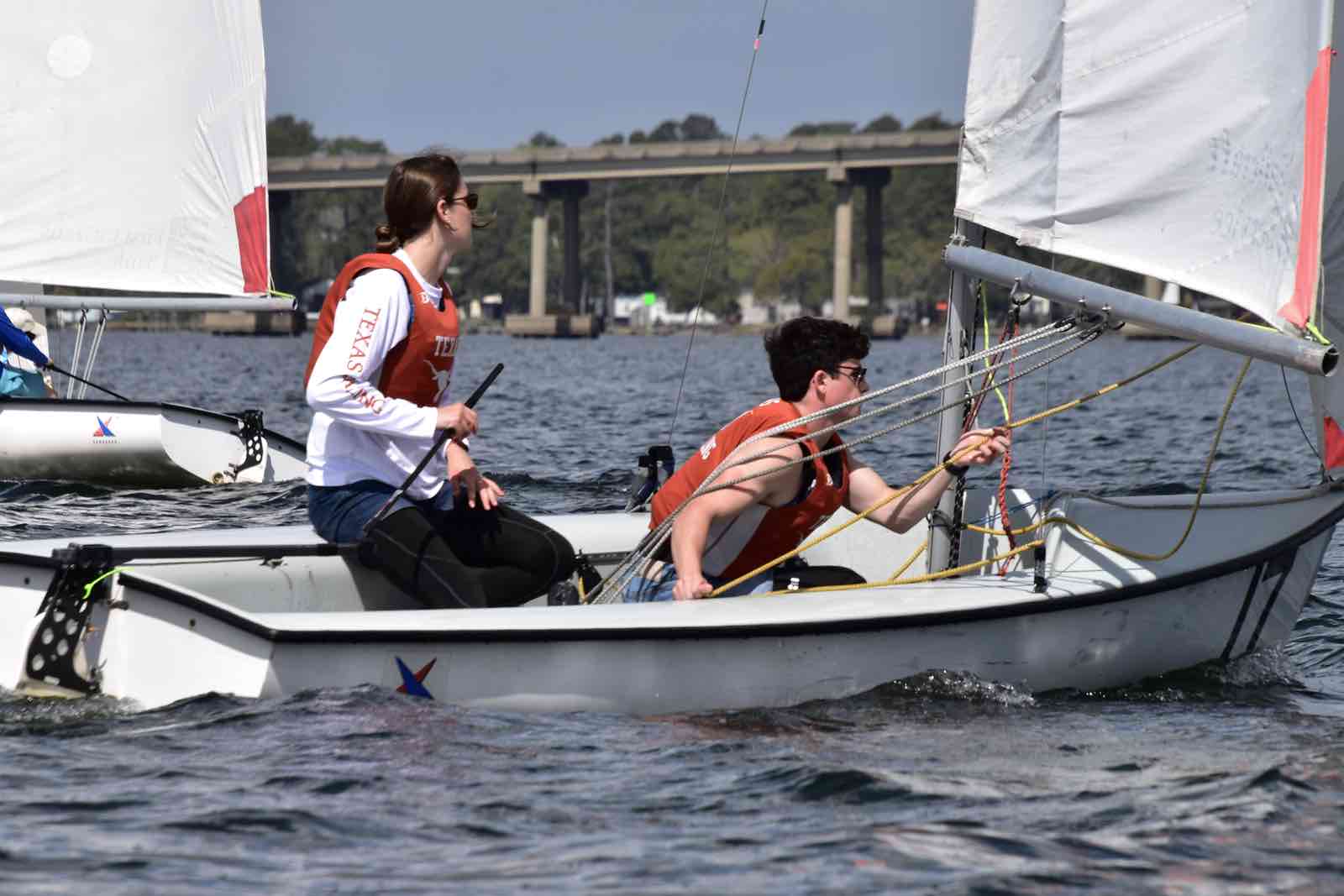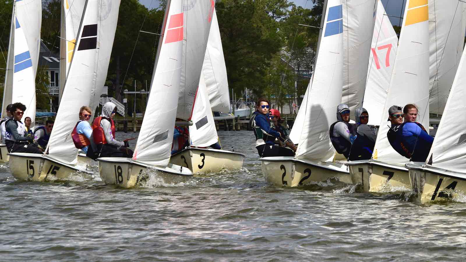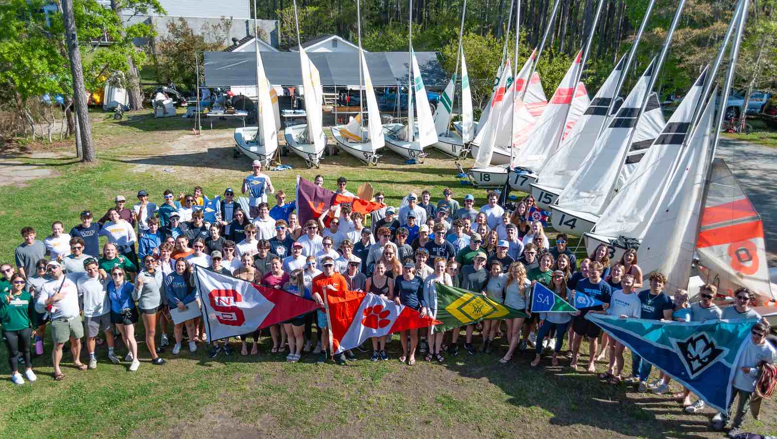 Group photo before the races begin. (Caz Doyle photo)Tha Canadian saililng crew from Queen’s University, Kingston, Ontario.Clockwise from top: San Diego, CNU, TexasWilliam & Mary crew shift around a moving boom.Fleet A on the Neuse, early Saturday morning.Not only were winds high, but waters were low. Some boats ran aground.The SailPack Regatta happens every April.