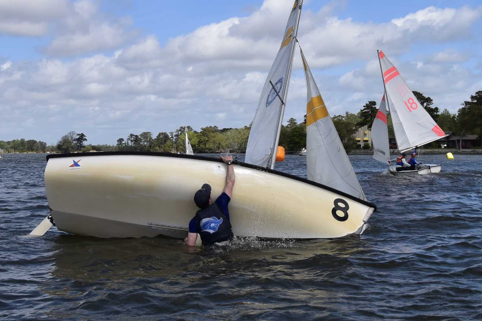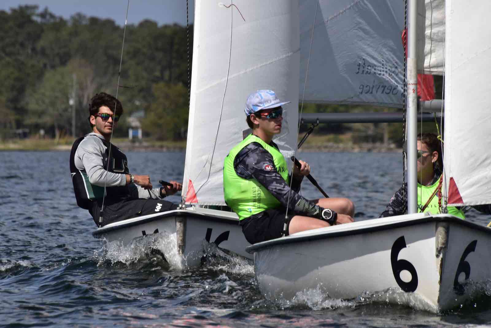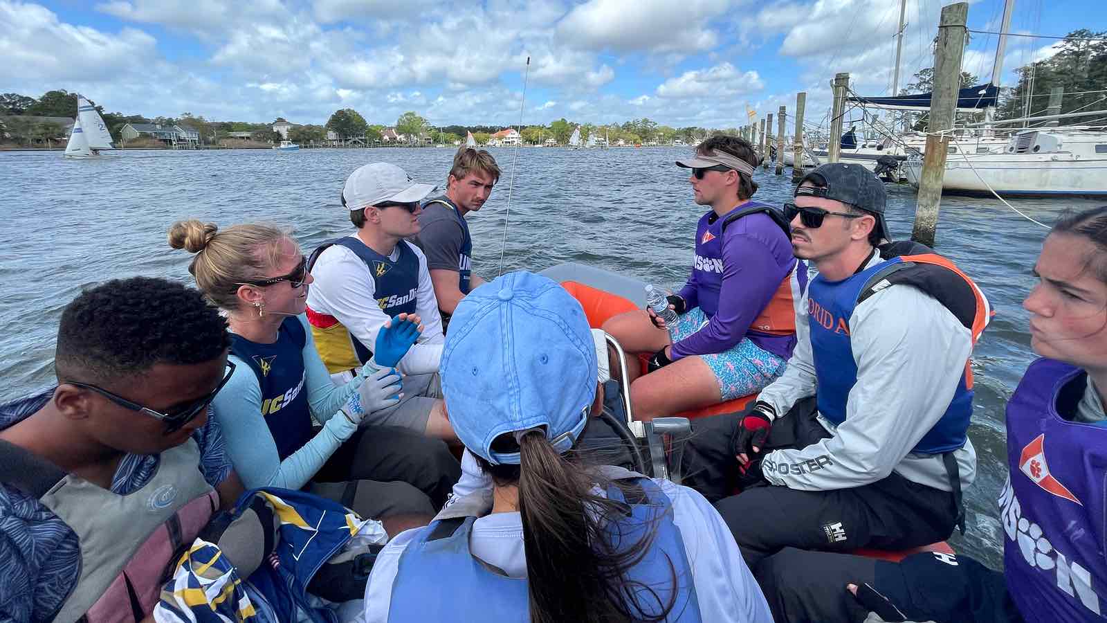 The Embry-Riddle crew post capsize in the creek.On the Neuse, clockwise from top: University of North Carolina, NC State, Michigan.Saturday, hull #4 was still taking on water and was towed in to be replaced.Resting between races.One crew in, one crew out.SailPack at the mark. (Jennifer Smart photo)Clockwise from top: Arizona, Embry-Riddle, and Ole MissCrews rotate from shore to boat via RIB.Around the marks.Trying to rid hull 4 (Embry-Riddle) of water between races. The boat was repaired Saturday night, but had to be switched out for Sunday’s races.USF maximizes the light wind.The view from Lou Mac Park.Looking for lost sunglass near the Committee Boat, Saturday.Saturday’s fleet formation.Several boats capsized in the creeks on Saturday. It’s not easy getting back in the boat.Sunday’s fleet on the creeks.The William and Mary crew return to the boat after capsizing.Georgia Tech, the University of Texas, and the University of South FloridaAttaching a new jib shackle. The pin in the old shackle had bent from the strain.Burgees of the 19 universities that participated in the 2026 SailPack Regatta/