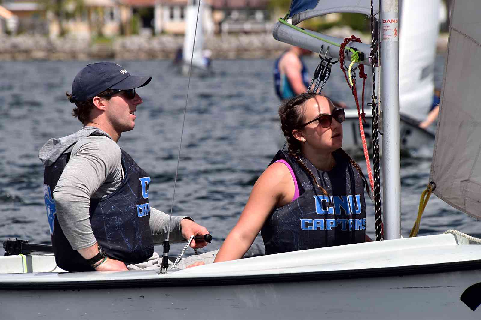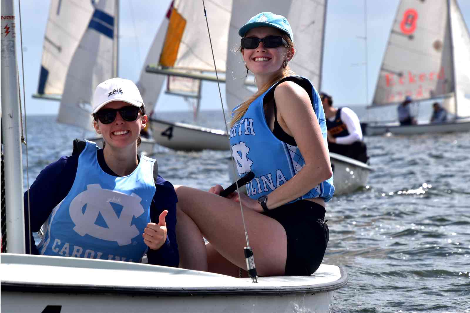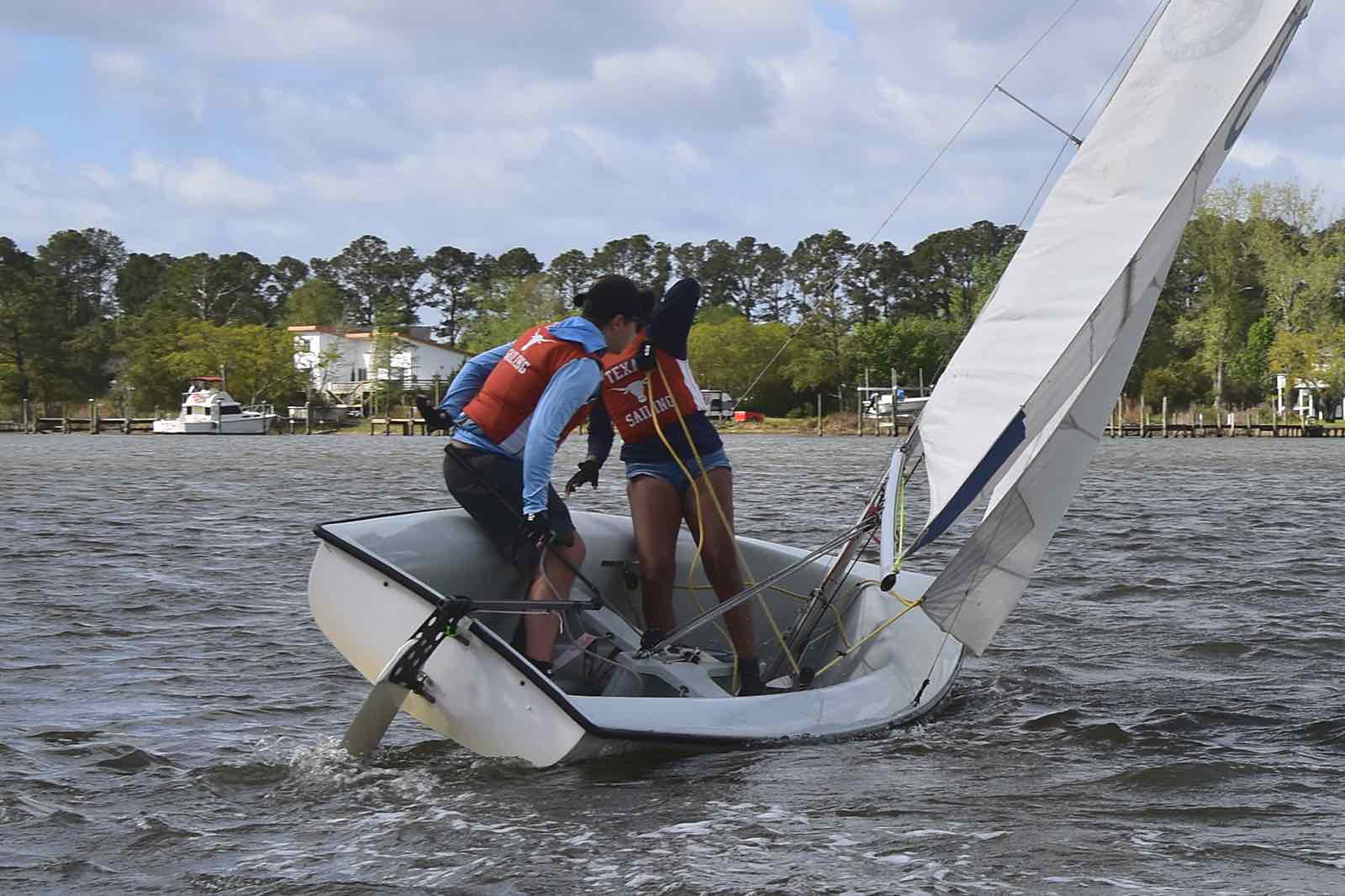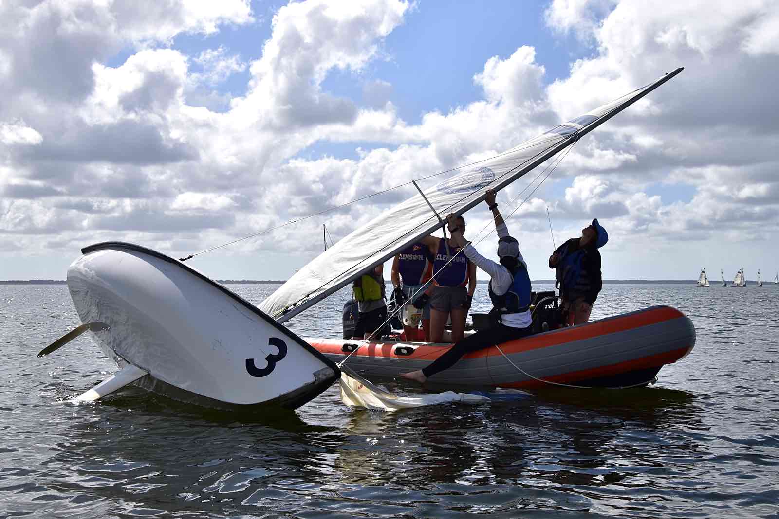 The Embry-Riddle crew post capsize in the creek.On the Neuse, clockwise from top: University of North Carolina, NC State, Michigan.Saturday, hull #4 was still taking on water and was towed in to be replaced.Resting between races.One crew in, one crew out.SailPack at the mark. (Jennifer Smart photo)Clockwise from top: Arizona, Embry-Riddle, and Ole MissCrews rotate from shore to boat via RIB.Around the marks.Trying to rid hull 4 (Embry-Riddle) of water between races. The boat was repaired Saturday night, but had to be switched out for Sunday’s races.USF maximizes the light wind.The view from Lou Mac Park.Looking for lost sunglass near the Committee Boat, Saturday.Saturday’s fleet formation.Several boats capsized in the creeks on Saturday. It’s not easy getting back in the boat.Sunday’s fleet on the creeks.The William and Mary crew return to the boat after capsizing.Georgia Tech, the University of Texas, and the University of South FloridaAttaching a new jib shackle. The pin in the old shackle had bent from the strain.Burgees of the 19 universities that participated in the 2026 SailPack Regatta/