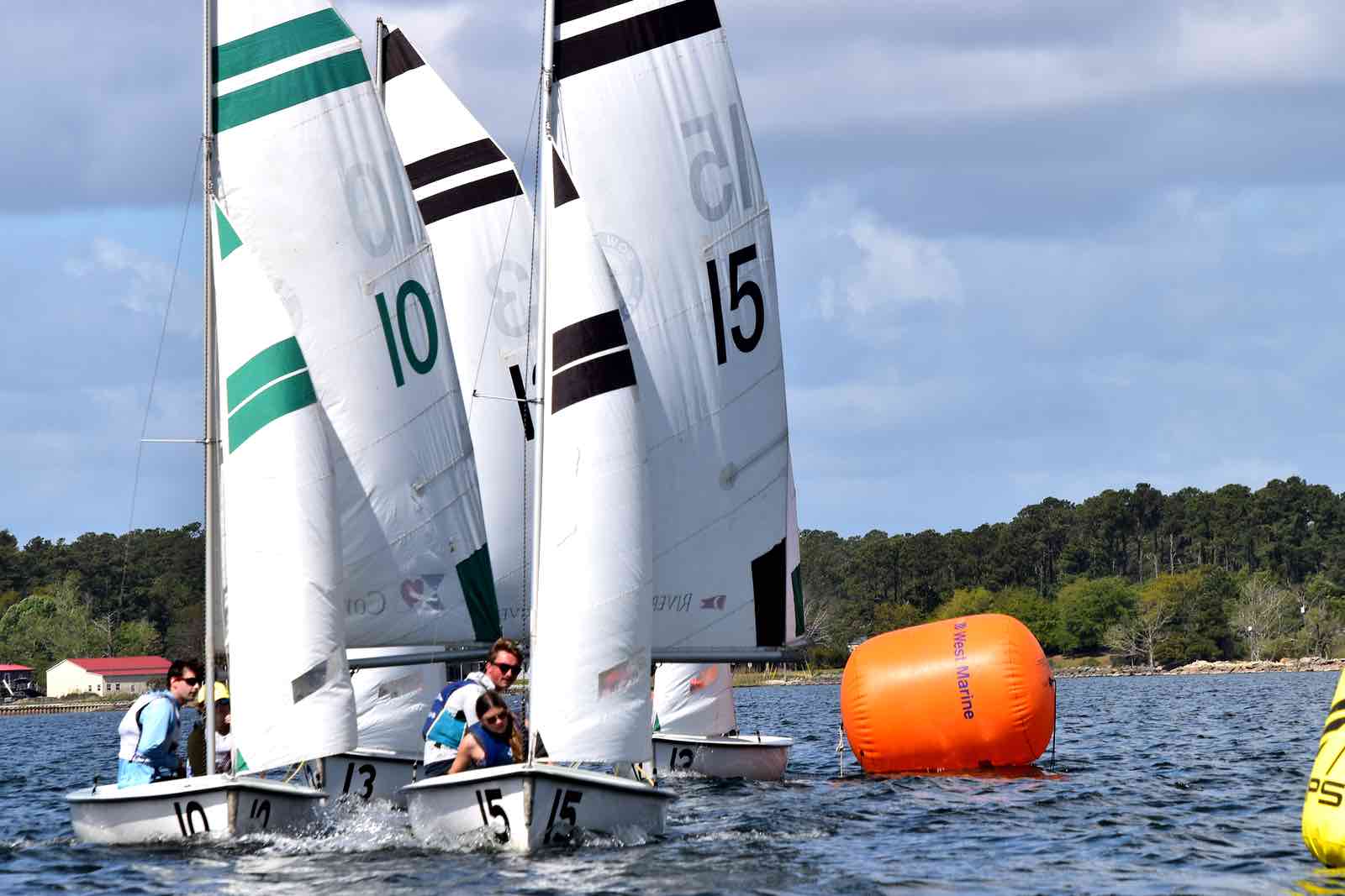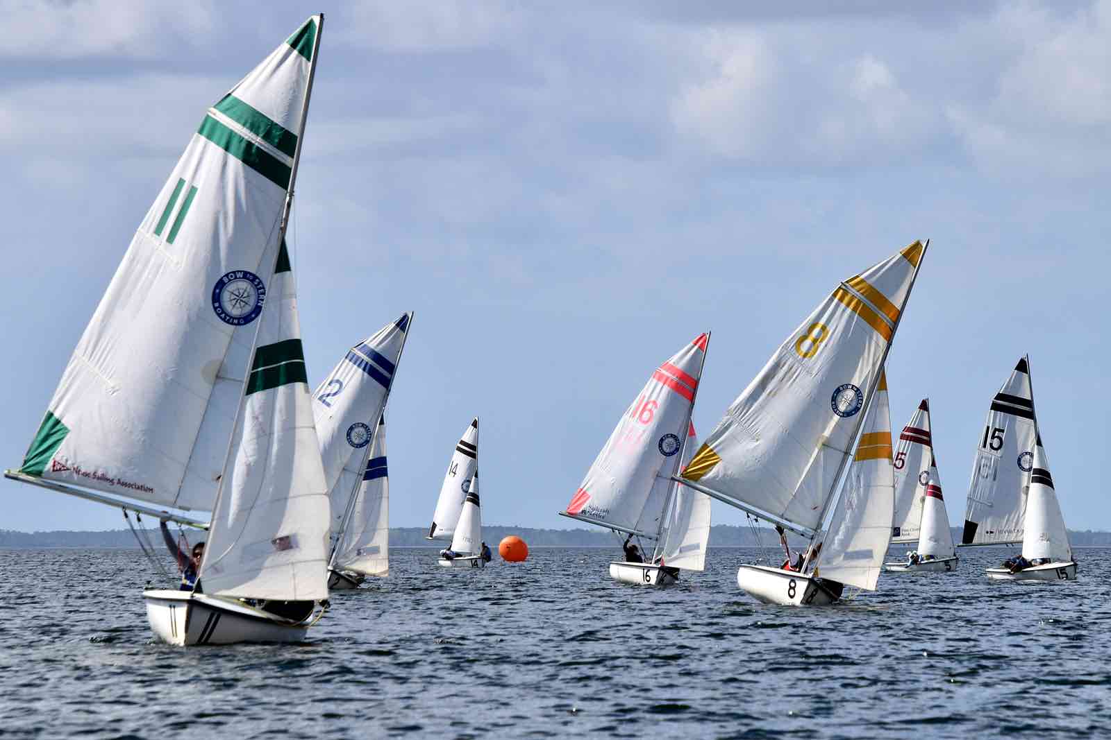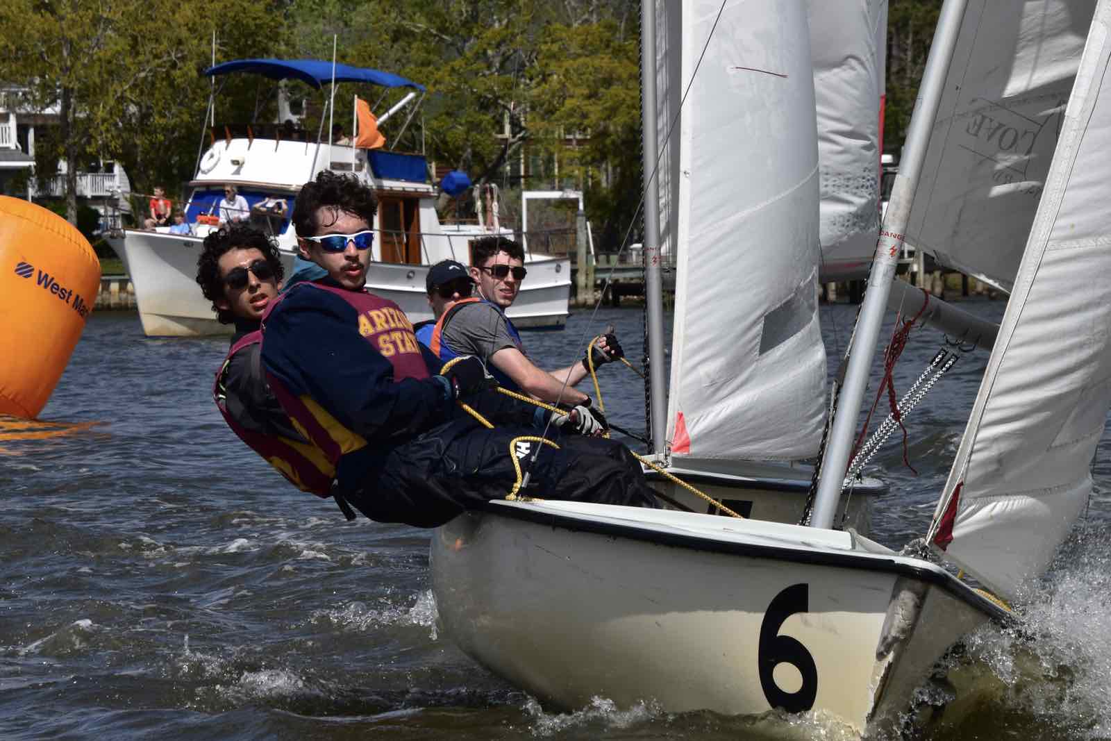 Canadian crew The Queen’s Gaels sails away from the mark. They took second place overall.It was an opportunity for sailors to show off their skills, from sailing in light winds on a roomy river course to competing in a tight formation among white caps in the narrow creek.