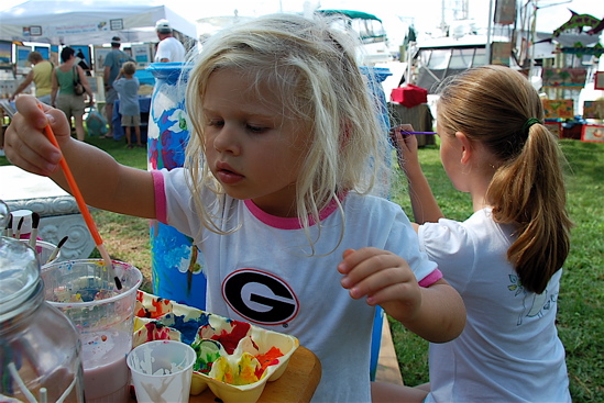 One of the youngest artists on hand. Meherrin Stansell prepares to paint the rainbarrel that will go to the Heartworks Center for kids in Bayboro.In addition to the displays by artists, the show gave children a chance to make some art of their own, while several musicians played on the marina’s deck through the day.