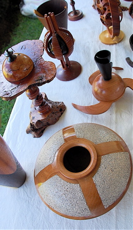 Manfred Rott turns a lathe and takes the wood and the imagination for a spin. One piece had what looked like a boat deck’s non-skid on it but Manfred said it was paint that ran, which he then varnished over. (If he called it non-skid, however, it’d qualify as ‘marine’ and a 20% markup.)