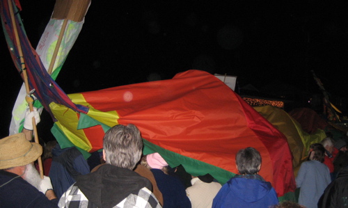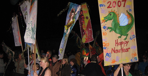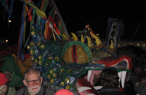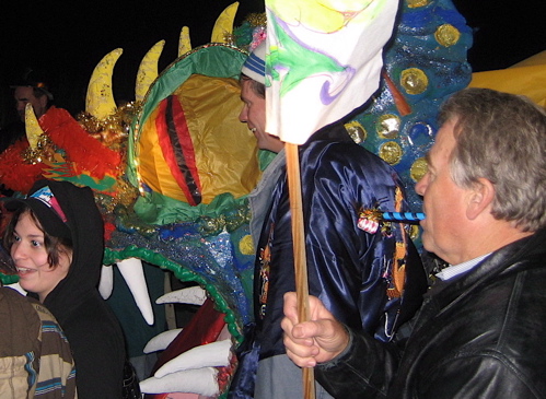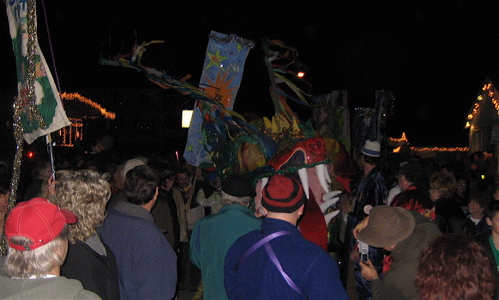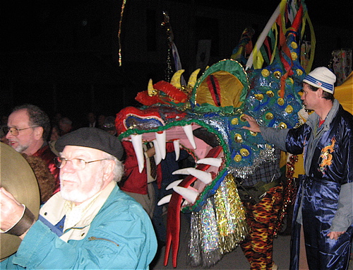 The Dragon wends its way down Hodges Street, led by Tim Rogers (in silks). Mike Vardy provides rhythmic cymbalismThe dragon is a visually stunning creature, lovingly primped by a loyal crew. This year, he was even given a new body (no more bamboo poles for the folks underneath to hold up)