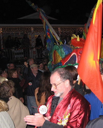 The going was slow through the crowd as most people reached in to touch the dragon for good luck.Also contributing to the specialness of the scene is the noise. Traditionally, Oriental residents and visitors have grabbed a kitchen pot and spoon and made all the racket they could. (A good spaghetti pot can keep your ears ringing for a while.) Add a few boat horns, bells and whistles and a true cacaphony kicks in.