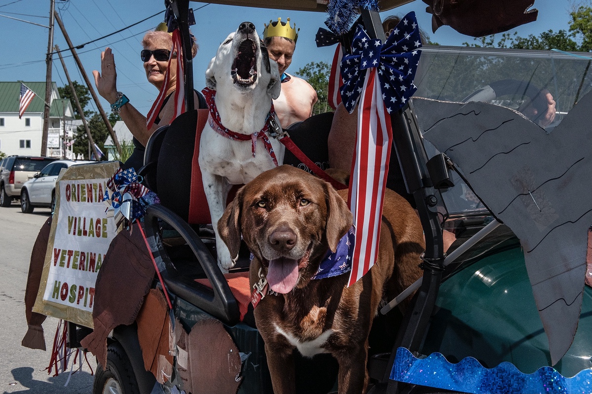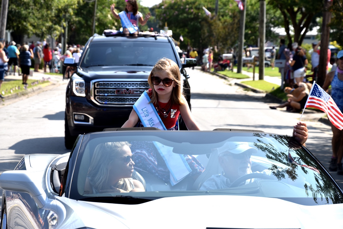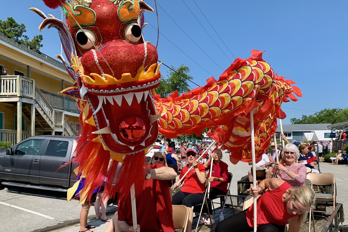 Parade Master Fay Bond relaxes in the shade. The 97 year old wears her Senior Olympic medals, the last won in 2019.Sometimes, retirement means wearing a Hawaiian shirt while participating in a rolling Kazoo chorus.Oriental United Methodist Church had a BBQ Chicken dinner (cooked by Jim Kellenberger) with green beans, potatoes, slaw, and a dinner roll – all for $10. With only 120 plates, the food went fast.Dad’s pockets can hold a lot of parade candy.The 2d Marine Division Band.The 2d Marine Division Band marching in the parade. At top, the band master indicates a turn onto Hodges St.Tony Santore stepped up as this year’s Parade Master.The many kids at the Flounder Festival.Even Snowie got in on the firework action.The Chinese Dragon shows up for the Flounder Festival.The scene on Hodges St. pre-parade.The Tiki Bar float featured a mermaid and her friends.Every parade should have a majorette with a flaming baton.Fireworks as seen through the masts of Oriental Yacht Club.Semi-patient Little Miss Flounder contestants await the judges’ decision.Serenity Henries (second runner-up), Haidyn Raines, and Addisyn Henderson.Alaina Garcia, Little Miss Photogenic, Tinsley Ormond, 3rd Runner Up, and Ava Foughty, 2nd Runner Up.Cataleya Veliz, winner of the Little Miss Flounder title.A John Deere tractor letting everyone know about Oriental’s Ham Radio club.Little Miss Photogenic, Alaina Garcia, rides in the lead car for the Little Miss Flounder contestants.