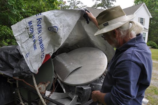Gary Gresko’s studio outside Oriental. At right is part of the sculpture, “Service”.Gary points to one and then another of the semi-tubular forms that rise as high as seven feet in the air. “Some of those were fuel tanks,” he says. “That was some kind of pontoon. This is part of an army truck fender… off of a big truck.”
