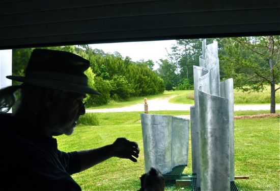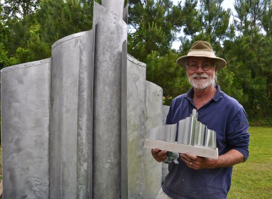 Gary Gresko in his studio, and just outside, part of the sculpture, “Service” which is now installed in Fayetteville at the NC Veterans’ Park.Gary says that the design deadline was looming when he had to go to New Orleans for another job. He worked on the design on the way back to Oriental. “We were driving home and I’ve got my sketch pad and paper and we’re driving thru Alabama and I’m rolling pieces of paper. I tore the paper because I didn’t have scissors. I’m gluing and taping and playing around.”