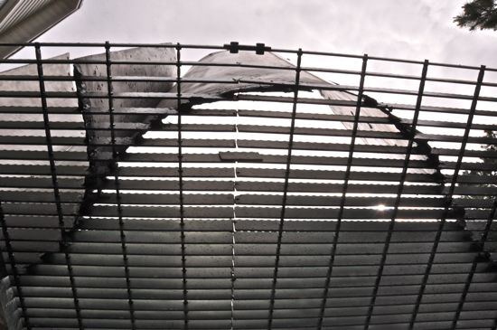 A view from below shows the grid of the grate and the curve of the aluminum in part of Gary Gresko’s sculpture, “Service.”There are no sharp edges in this piece honoring military service. It’s all curves. Along the edges of those aluminum semi-cylinders are strips of rivets, something that Gary added to the sculpture. “The rivets represent the common bond military service people have. That’s why I wanted to rivet it together.