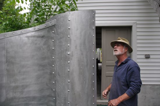 A view from above of the repurposed aluminum, part of the sculpture Gary Gresko was working on in May.Gary hired someone who spent two weeks grinding the aluminum free of the paint. “He ground the metal raw,” It was not quiet work, says Gary. “It’s loud when you work with aluminum. It’s a loud material and vibrates.”
