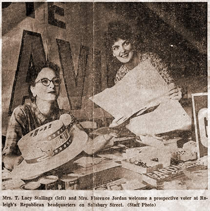 Jackie in a 1964 Raleigh News & Observer storyJackie Stallings’ determination also came through in her religious life and political work. Her family says that some difficulties during the birth of her third child, Kathy and questions of whether she would be ambulatory (she was) led to “a life-changing commitment to Jesus Christ.” She led Bible studies, Sunday school and church activities in Raleigh and Oriental. She was also active in political campaigns for many conservative candidates in both places where she lived. In Raleigh, as a news clipping from the 60’s notes, she was part of an emerging GOP.