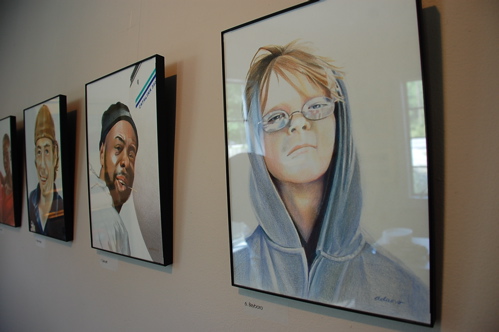 A visitor at the opening reception on Sunday peers more closely at a face in one of Marion Adams’ colored pencil portraits. On the facing wall, a silo scene by John Hanley.Marion Adams has been drawing portraits of people she meets in the county, whether it be at the Piggly Wiggly or at the Paul’s vegetable stand on Hiway 55. Also among her subjects are Sylvia and Brantley Norman of Village Restaurant and Oriental police chief Jeff Casassa.