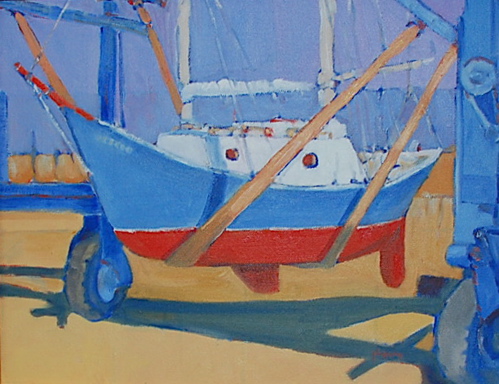 Is that beeping we hear? “Swinging” A TravLift sling on canvas.Another of Hanley’s paintings plays on a common sight here – boats supported by stanchions. He says the one in his painting was at SailCraft. It’s titled, “Sea Legs.”