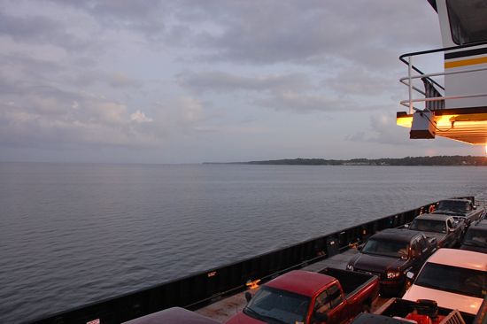An early morning commute on the Minnesott-Cherry Branch ferry.One notable change for commuters from Pamlico County who work at Cherry Point is that there is now an earlier — 5:25a — run from Minnesott to Cherry Branch. That’s also the departure time for the first run from the Cherry Branch side, a slightly later start than before.
